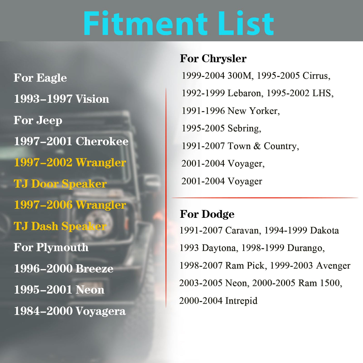 Replacement Speaker Harmony Ha-R5 Speakers Wiring Harnessreplacement Speaker Harmony Ha-R65 Speakers Wiring Harnessfeature No Cutting Or Splicing Needed. Plug And Play. Put Directly Into Car Speaker Connector To Make Installs Quick And Easy. Replacement For Your Old Or Broken Ones And Update Your Door Speaker Quality. Replacement For Designed For 1991-2007 Chrysler Dodge Jeep Eagle Plymouth Speaker Adapter Harnesses Fitment: Chrysler: 1999-2004 300M, 1995-2000 Cirrus, 1992-1999 Lebaron, 1995-2002 Lhs, 1991-1996 New Yorker, 1996-2004 Sebring Coupe, 1995-2006 Sebring Sedan, 1991-2007 Town &Amp; Country, 2001-2004 Voyager, 1999-2005 Pt Cruiser, 1999-2004 Concorde Dodge: 1991-2007 Caravan, 1994-1999 Dakota, 1993 Daytona, 1998-1999 Durango, 1998-2007 Ram Pick, 1999-2003 Avenger, 2003-2005 Neon, 2000-2005 Ram 1500, 2000-2004 Intrepid Eagle: 1993-1997 Vision Jeep: 1997-2001 Cherokee, 1997-2003 Wrangler Plymouth: 1996-2000 Breeze, 1995-2001 Neon, 1984-2000 Voyager Package Included: 2 X Speaker Wire Harness Adapter