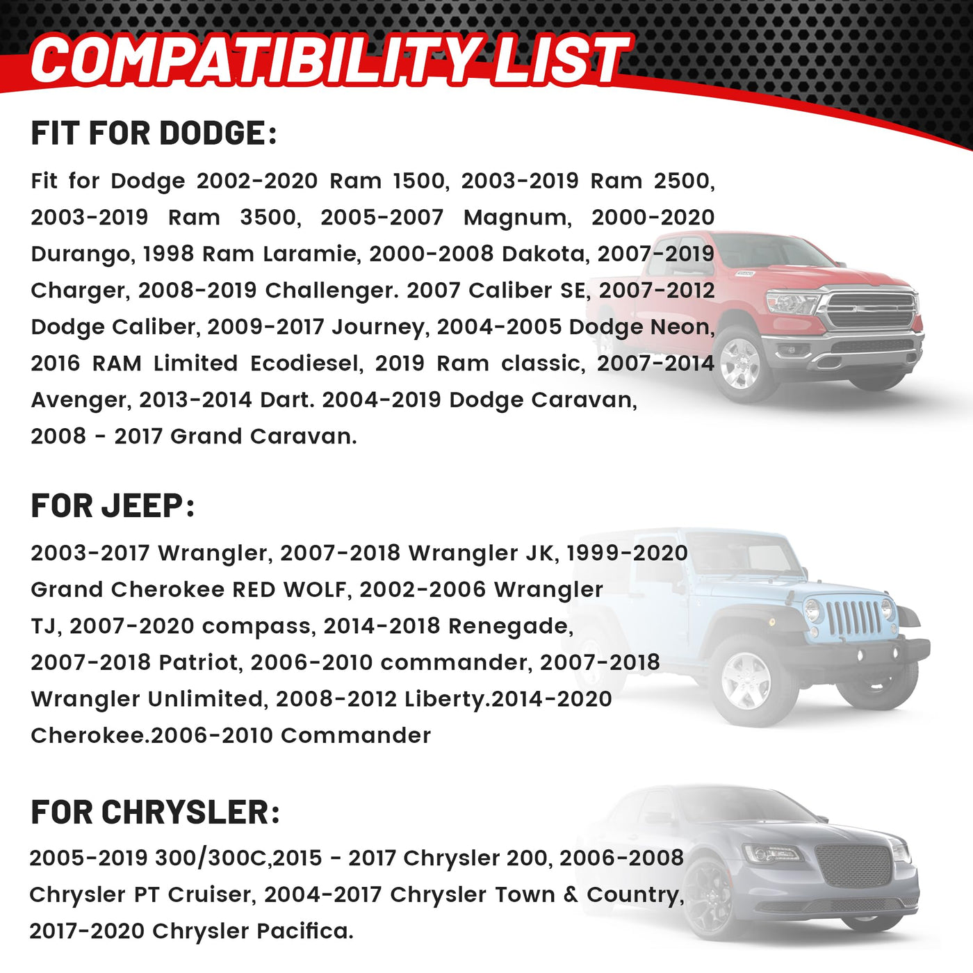 Q: What vehicles are compatible with the RED WOLF Door Speaker Wiring Harness Adapter?A: The RED WOLF Door Speaker Wiring Harness Adapter is compatible with a variety of vehicles including 2002-2020 Ram 1500, 2003-2019 Ram 2500 and 3500, 2005-2007 Magnum, 2000-2020 Durango, and multiple models of Dodge, Chrysler, and Jeep such as the 2003-2017 Wrangler and 2005-2019 Chrysler 300.