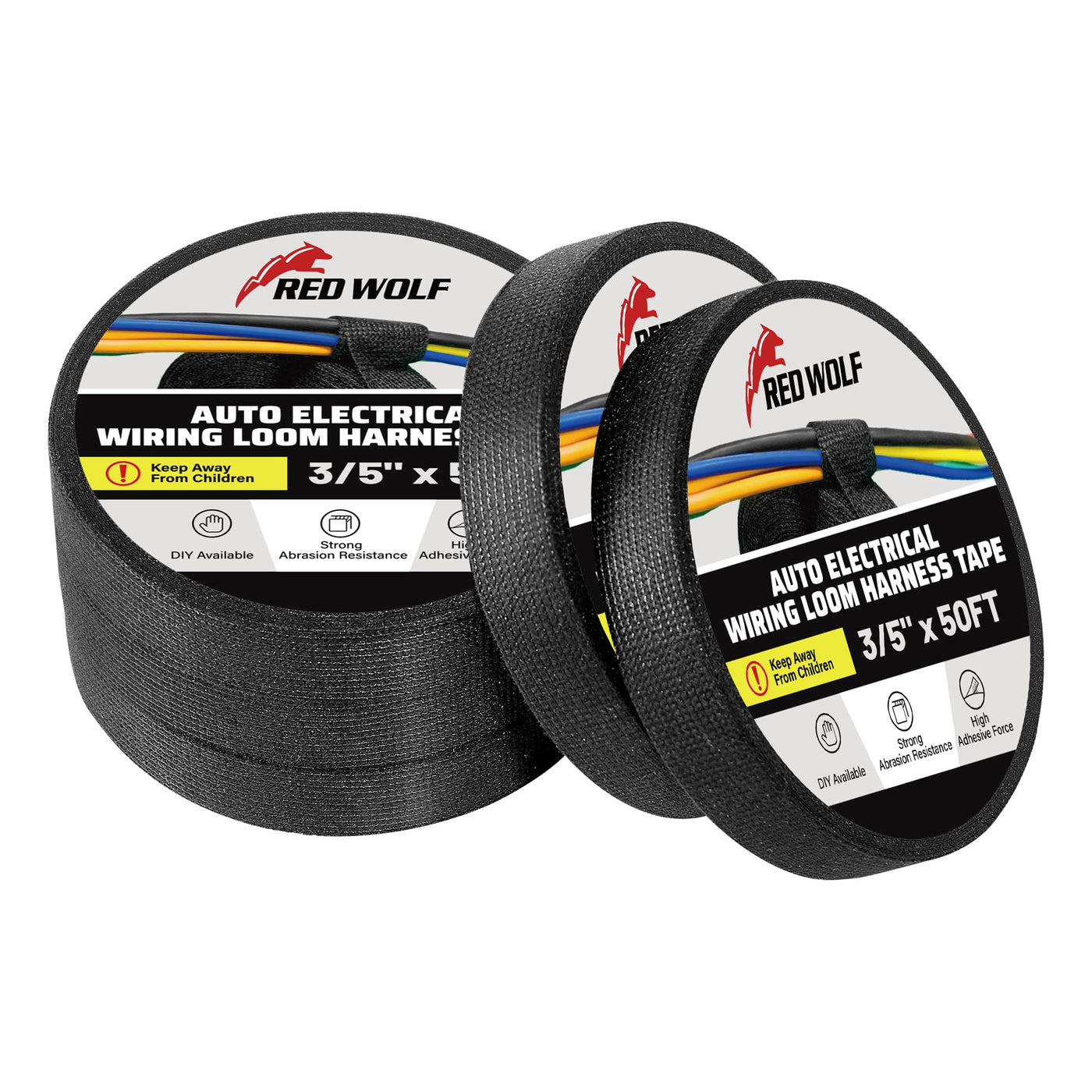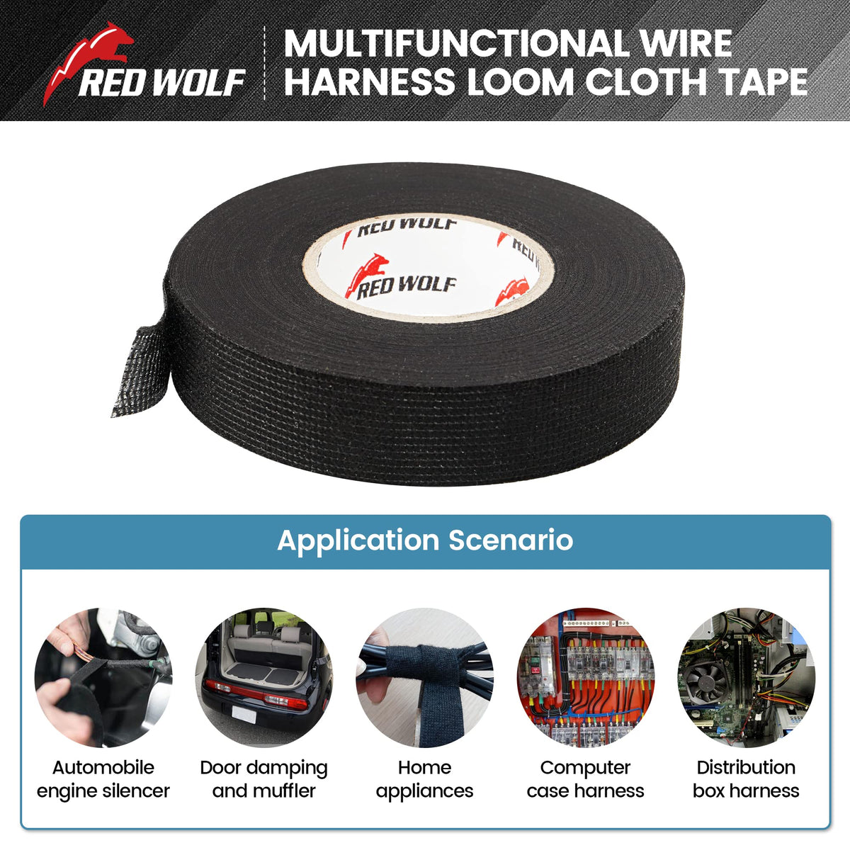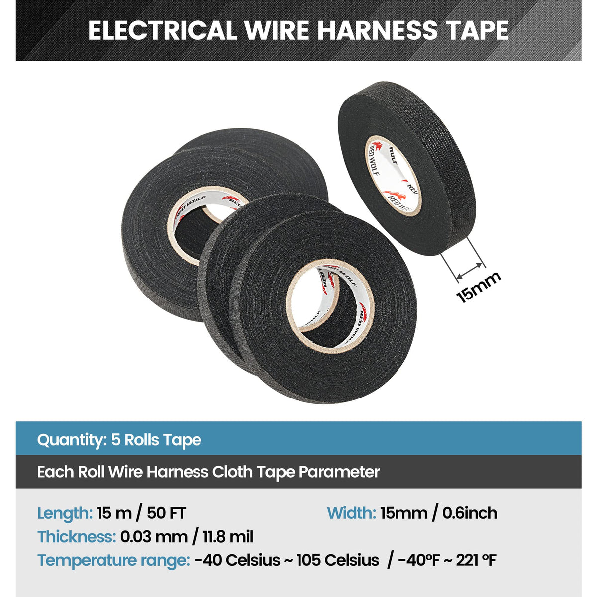 Red Wolf Wiring Harness Cloth Tape High Temp Self Adhesive Fabric Tape For Automobile Electrical Harness Wrap Noise Damping Protection Insulation Cable Fixed Black, 5 Rolls 3/5 Inch X 50Ft