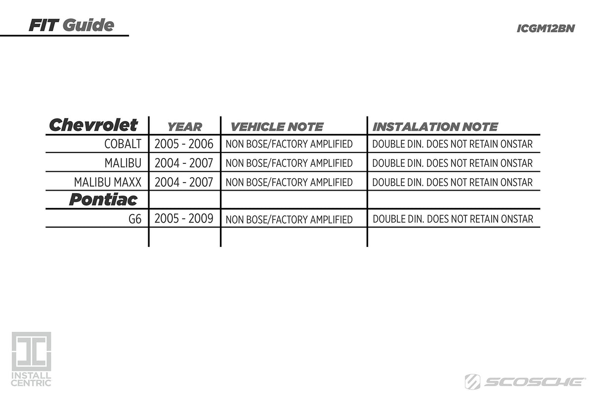 Descriptionthe Install Centric Icgm12Bn Complete Installation Solution Is An Ideal Choice For Installing An Aftermarket Stereo Into Your Gm 2004-09 Class Ii Vehicles Without Altering The Dash. Everything You Need To Perform A Basic Aftermarket Stereo Installation Is Included: The Dash Kit, Wire Harness, Antenna Adapter And Wire Connectors. The Single Din Dash Kit Includes A Kit Panel, A Trim Ring And Brackets And Is Manufactured From High-Grade Abs With Precision Tolerances So It Delivers A Gapless Fit Between The Dash And The Kit. The Wire Harness Allows You To Connect To The Factory Harness Without Cutting Any Wires. The Icgm12Bn Kit Includes Step By Step Instructions And Colored Coded Wires For An Easier Installation.