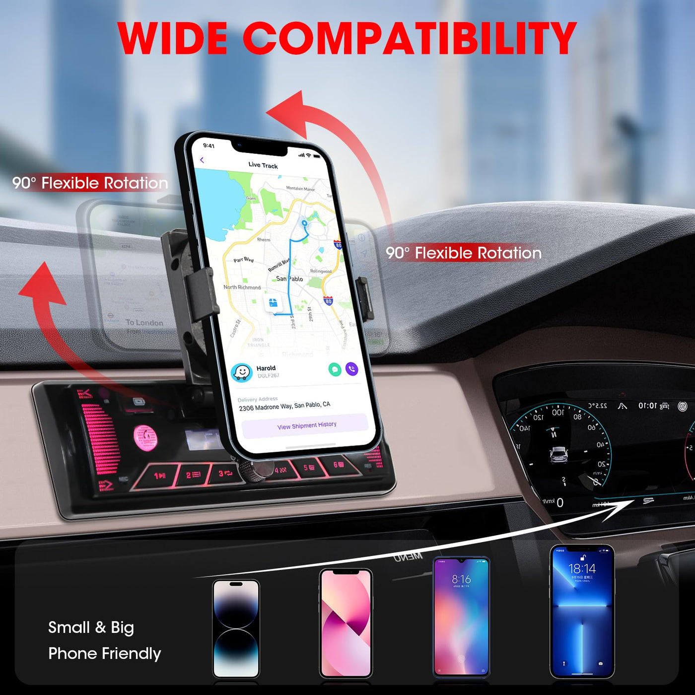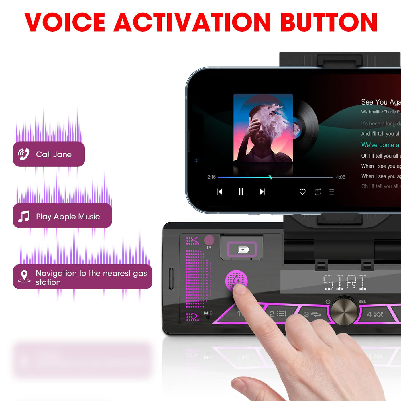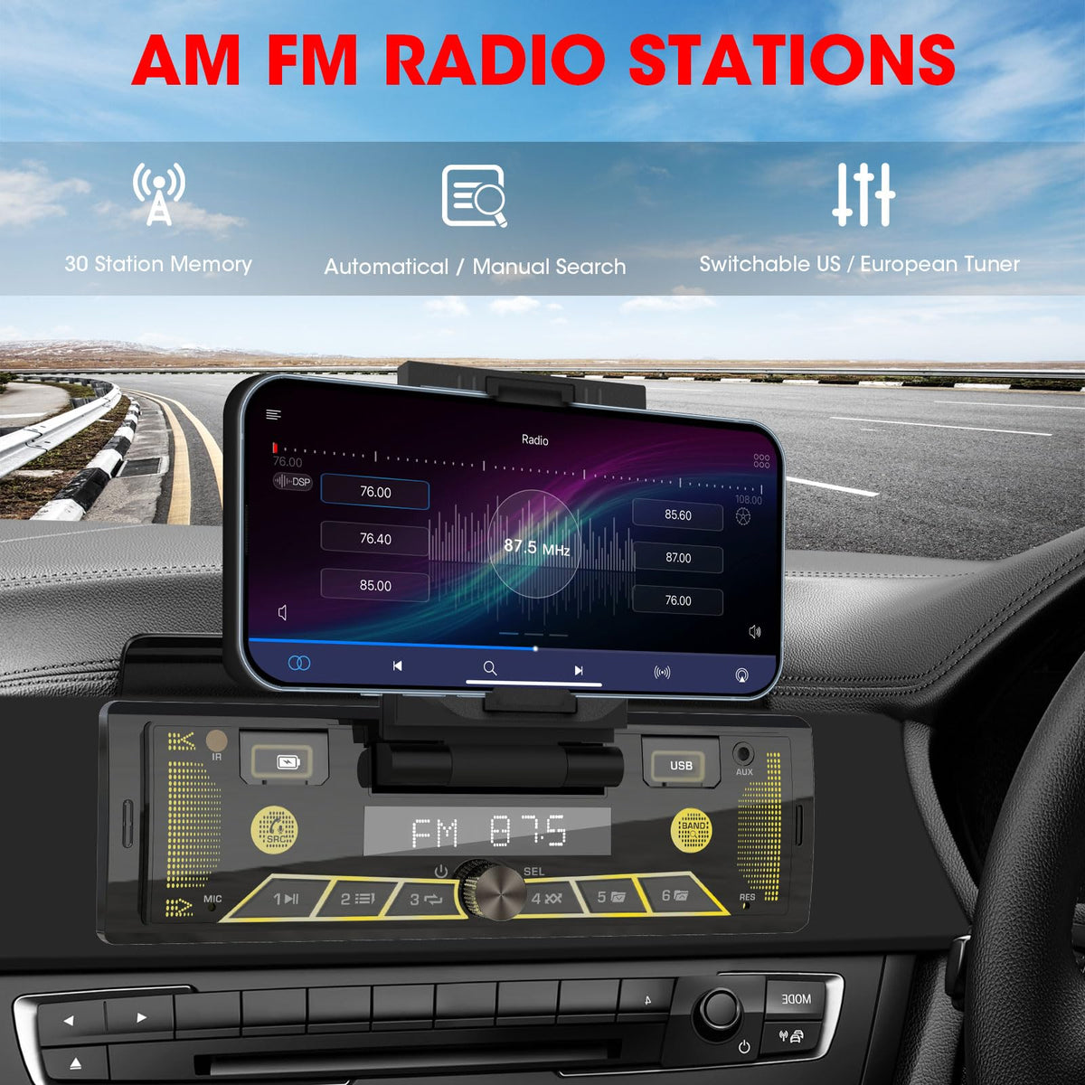 Single-Din Stereo With Car Phone Holder - Bluetooth Car Radio - Push To Talk Assistant Multi Color Lcd Am Fm Tuner Aux Usb Built-In Mic Wireless Remote Control