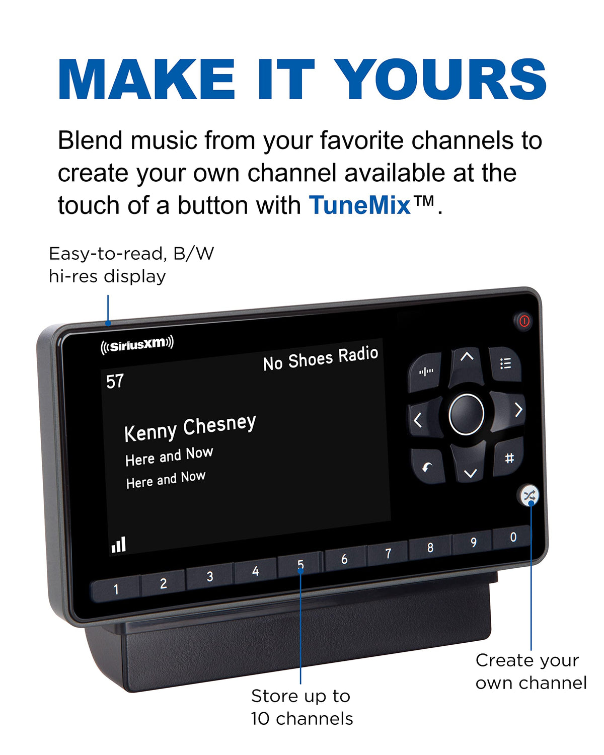 Q: Can I customize my listening experience with the SiriusXM SXEZR1V1?A: Absolutely! The SiriusXM SXEZR1V1 allows you to store up to 10 of your favorite channels and use the TuneMix feature to create a personalized blend of selected channels, enhancing your listening experience.
