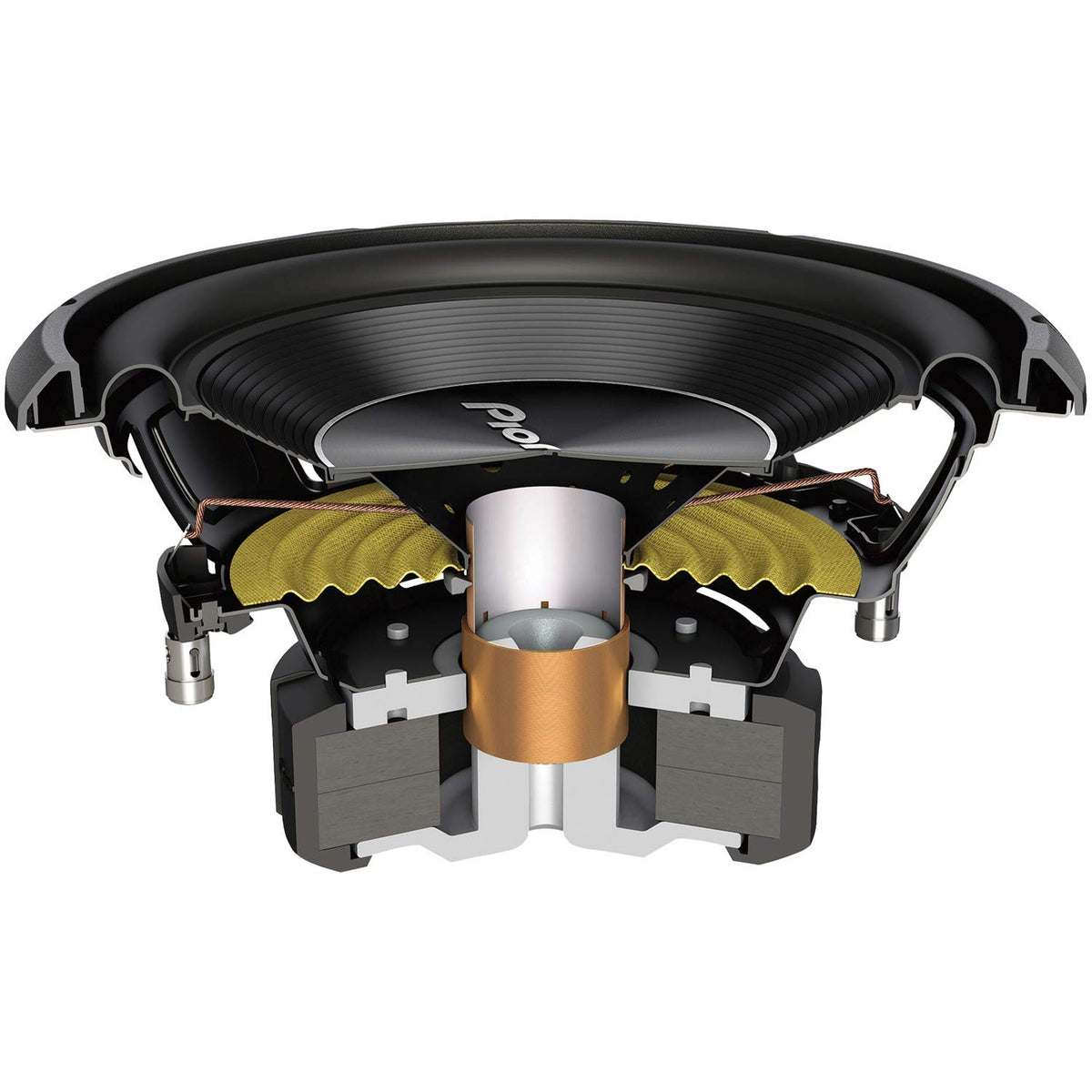 Q: What type of materials are used in the construction of the TS-A250D4 subwoofer?A: This subwoofer features a 10" cone made from glass fiber and mica interlaced injection molded polypropylene (IMPP), along with a butyl rubber surround and aramid fiber spider, ensuring durability and excellent sound quality.