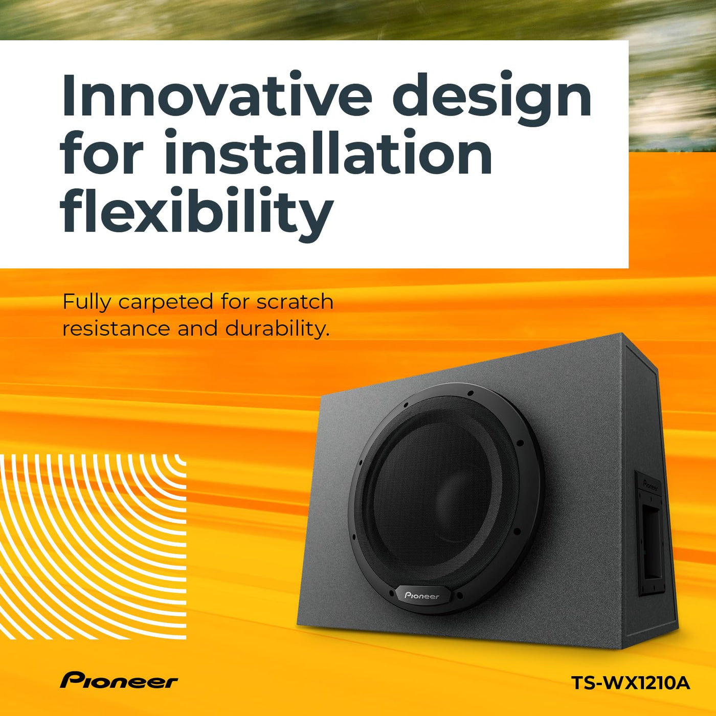Q: Can the Pioneer TS-WX1210A subwoofer be easily installed in my car?A: Yes, the TS-WX1210A is designed for flexible installation. It can be installed freely in the cabin or under seats, and its innovative shape allows for optimal bass tuning by repositioning the subwoofer to fire rear, front, or upwards.