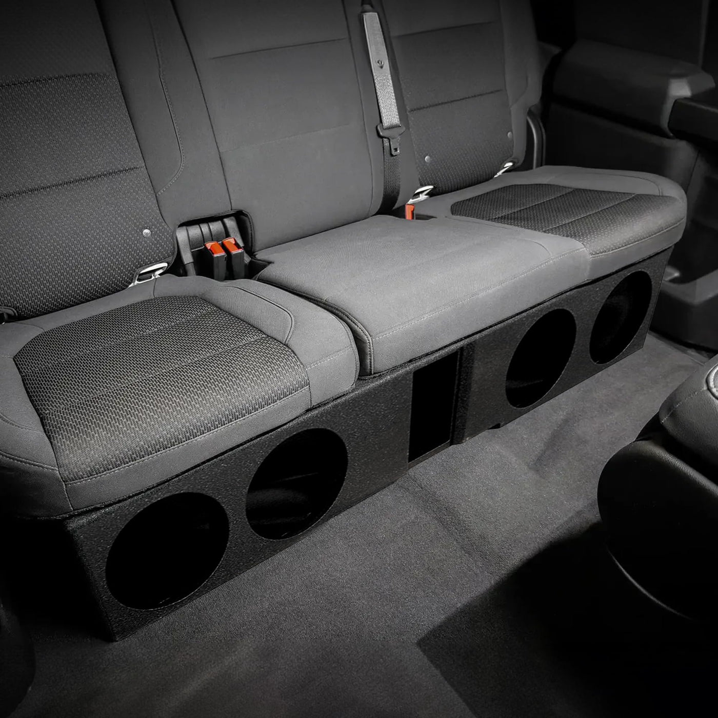 Experience The Premium Sound Your Subwoofers Deserve With The Qpower Qbomb 8-Inch Quad Ported Subwoofer Box With Bed Liner And Underseat Down Front Fire For 4 Subwoofers The Enclosure Features Four 8-Inch Ported Openings, Providing An Ideal Fit For Your Subwoofers While Allowing Efficient Airflow To Maximize Bass Performance Its Sturdy Cover Is Specifically Engineered For Utmost Durability, Safeguarding Your Subwoofers And Guaranteeing Musical Longevity Even Under Intense Usage Constructed From A Robust Bed Liner Material, This Enclosure Ensures The Protection Of Your Subwoofers And Contributes To Maintaining The Pristine Condition Of Your Vehicles Interior The Rugged Construction Shields Your Equipment From Unnecessary Wear Or Tear, Providing A Reliable Solution For Long-Term Use And Enjoyment Once Installed, The Enclosure Will Take Your Speakers To A New Level, Delivering Enhanced Sound Quality With Underseat Frontfire Capabilities, This Enclosure Facilitates The Production Of A Louder And Crisper Sound Than Ever Before You Can Freely Crank Up The Bass To Your Preferred Level, As The Enclosures Design Is An Excellent Spot For Bass Enthusiasts, Boasting A Comfortable Tuning Frequency Of 35 Hertz Turn Up The Volume And Immerse Yourself In The Captivating Sound Produced By The Qpower 8-Inch Ported Subwoofer Enclosure Box