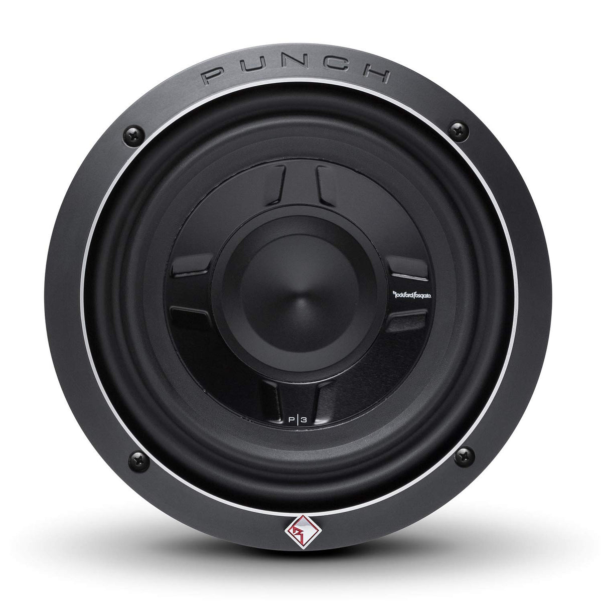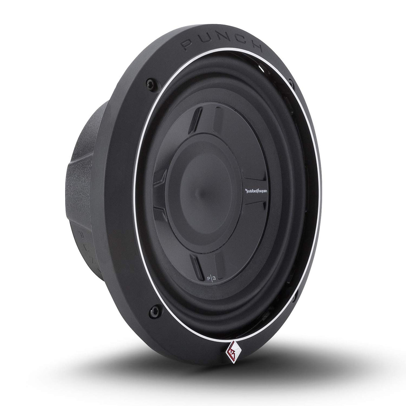 The Rockford Fosgate P3S Series Shallow Mount Subwoofers Deliver Punch, Designed To Deliver Big Bass In A Tight Space, With Its Low Profile Mounting Depth Design | The Punch P3Sd4-8 Is A Slim 8� 4-Ohm Dvc (Dual Voice Coil) Subwoofer With 150 Watts Rms / 300 Watts Max Power Handling And Custom 10-Awg Nickel Plated Push Terminals | Featuring Anodized Aluminum Cones And Dustcaps, With A Unique Spider Venting Design To Keep The Motor Cooler And A New Hybrid Stamp-Cast Basket Providing Super Strength While Minimizing Weight And Resonance | Optimized For Both Sealed And Vented Enclosures {Sealed (Vb): 0.25 Cu. Ft. (7.0 Liters) / Vented (Vb): 0.75 Cu. Ft. (21.2 Liters) / Mounting Depth: 2.66 In. (67.5 Mm) / Cutout Diameter: 7.13 In. (181.0 Mm)} | Famous Rockford Fosgate Build Quality With A Full 1-Year Warranty