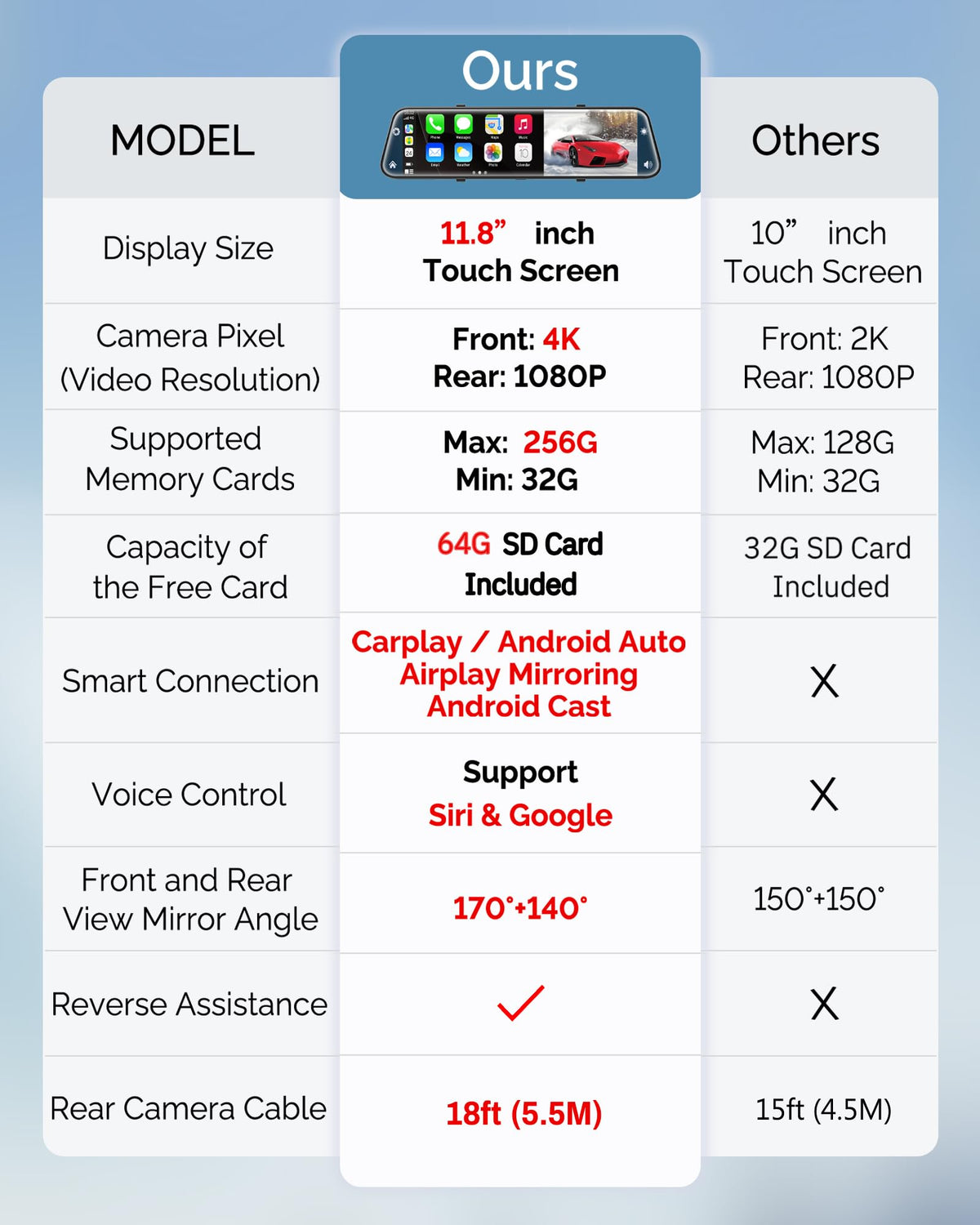 This Is A Powerful Dual Camera Rear View Mirror Car Recorder. It Is Equipped With Upgraded 4K Front Camera And 1080P Rear Camera, 170 Front View Angle And 140 Rear View Angle, Which Can Reduce Blind Spots And Capture Key Details Of Driving, And The Camera Microphone Can Be Synchronised With Recording (Can Be Turned Off).Support Voice Control, Turn On Bluetooth To Connect To Carplay And Android Auto Wirelessly, Through Sensitive Touch And Voice Control, You Can Use Maps, Videos, Music And Other Apps While Driving, As Well As Answer Phone Calls And Navigate, Making Driving Safer And Smarter.The 12-Inch Ips Screen Can Be Swiped Left Or Right To Switch To A Split-Screen Display, Enabling You To View Front And Rear Road Conditions At The Same Time To Reduce The Risk Of Accidents, And Can Also Be Combined With Carplay For The Ultimate Experience.There Are A Variety Of Driver Assistance Functions, 64Gb Card Full Automatically Overwrite The Old Unlocked Files To Achieve Loop Recording, G Sensor Locks The Video In The Event Of A Collision, Parking Assist Makes Reversing Easy, 24-Hour Monitoring Of Parking Abnormalities (Parking Monitoring Cable Needs To Be Purchased Separately).With Anti-Surge And Anti-Reverse Connection Protection, Safe And Durable. Four Audio Output Options With Fm Transmitter, Aux Audio Cable, Bluetooth, Connection To Car Stereo, And Built-In Speaker.