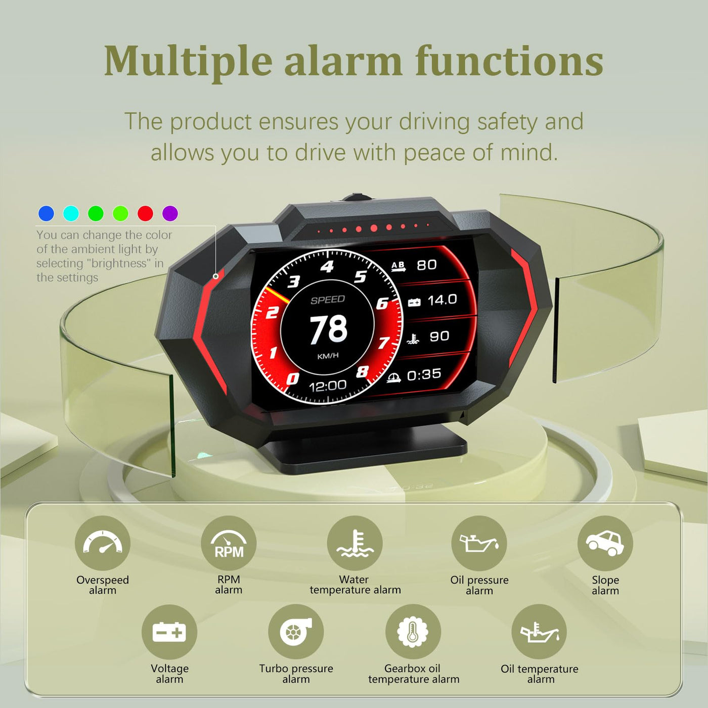 Multi Functional Trip Computer P24, This Head-Up Display Has Registered Multinational Appearance Patents And Display Image Copyrights. P24 Head Up Display Reads The Driving Data Of Both Vehicles Through The Obd2 Interface Of The Car Ecu, Such As Speed, Speed, Fuel Consumption, Water Temperature, Voltage, Etc. It Instantly Reads The Driving Information Without Shifting The Large Field Of View During The Driving Process, Avoiding The Driver From Looking Down At The Instrument Panel And Affecting Safety. Hud Does Not Rewrite Any Data In The Ecu. Multiple Languages And Displays: Hud Display Has English, Simplified Chinese, Traditional Chinese, Thai, Japanese, Korean, Russian, Arabic, Malay Language, Spanish, German And French. The Product Is Also Equipped With Ambient Lights, With 13 Display Screens That Can Be Easily Switched, Making It Aesthetically Pleasing And Practical When Placed Inside The Car. You Can Also Use It As A Small Decoration For Your Car.