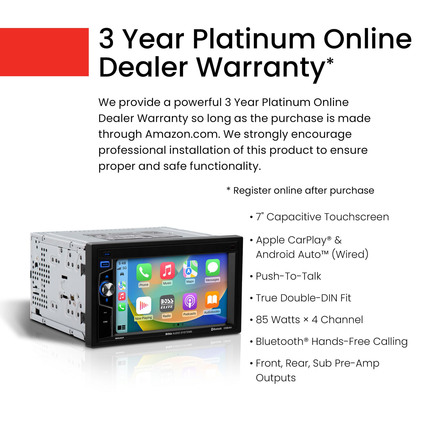 Q: Does the BOSS BE62CP come with a warranty?A: Yes, BOSS Audio Systems provides a powerful 3-year platinum online dealer warranty for the BE62CP Car Stereo, ensuring peace of mind when purchasing through authorized retailers like Amazon.com.