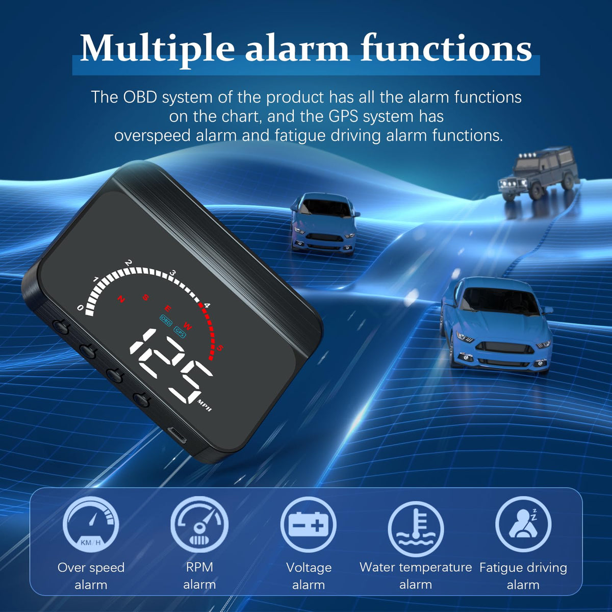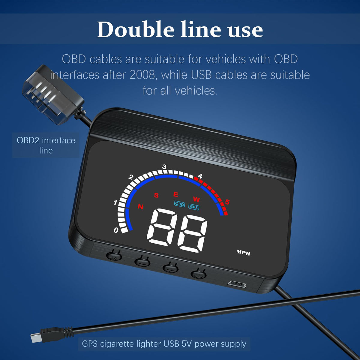 This Head Up Display Is A Projection Product Used On Car Windshields. Compared With Other Projection Speedometers, This Model Adopts A Blue And White Color Scheme For A More Beautiful And Clear Appearance, And Is Equipped With High-Tech Chips. Without Looking Down At The Speedometer, Car Data Can Be Viewed More Clearly On The Windshield. This Car Hud Comes With A Hood To Cover Multiple Light Sources On The Head-Up Display,No Glare When Driving At Night.Meanwhile The Car Heads Up Display The Use Of High-Tech Metal Nanotechnology To Eliminate Excess Hud Reflected Light Allows The Car Hud Display Clearer And More Visible Images.In Turn Hud Car Display Can Also Be Adjusted Automatically Or Manually According To The Intensity Of The Outside World Veloc Metro Digital Para Carro Brightness Of The Display Makes It Digital Speedometer Can Clearly Visible In Bright Light.The Windshield Speedometer Projector There Are Obd And Gps Multifunction Modes, While The Digital Gps Speedometer On-Board Diagnostic Dual-System Prompt Screen Can Switch Between Obd And Gps Dual Systems With One Click,Car Hud Display Windshield One Machine With Two-Way Interface Can Be Selected Arbitrarily.