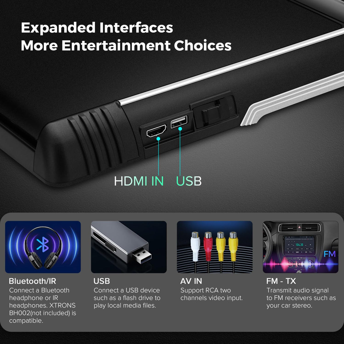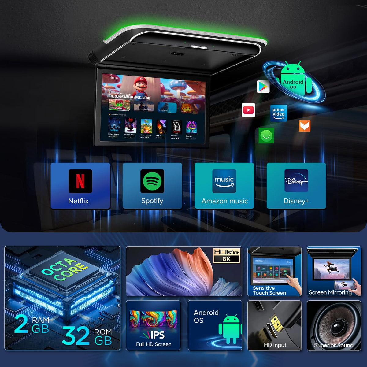 First Introduce Touch Screen Solution To Roof Mounted Monitorthe Interactive Touch Screen Solution Combines G+G Technology, Offering Convenient And Sensitive Touch Operations For Every Passenger.Tap, Swipe, Or Slide To Open Apps, Search/Play Media Files, Or Perform Any Settings With Your Fingers At Any Time.Immersive Experience With Android Appsfrom Youtube To Netflix, Vimeo, Spotify, Pandora, And Much More, It Brings Your Favorite Content Together In One Place.Built-In Wifi Modulewith Built-In High-Quality Wifi, It Unlocks Blazing Quick Data Speeds, You Can Download Music, Stream Videos, Or Install Apps With Little Lag.Screen Mirroringmirror Your Phones Screen On This Monitor. Share Photos, Videos, Games From Your Mobile Phones Without Downloading Any App.Note: It Supports Iphone With Ios 9.0 And Above, Android Phones With Android 8.0 And Above.Hdmi Inputthe Best Option To Connect External Devices Like A Game Consoles, Cameras, Video Recorder To Transmit Audio & Video In High Fidelity.Usb (Max Compatibility: 128Gb, Usb 2.0 Only)Expand Your Media Choices By Plugging Your Usb Stick Into This Unit To Play Music, Video, Or View Photos.Av Inputan Essential Interface For You To Use The Monitor Together With Your Car Head Unit.170 Max Open Anglethe Rotation Capability Lets You Adjust The Screen With Ideal Angle Up To 170, For Better Orientation And Greater Comfort.Virtual Touch Buttonsshow Up Only When Power On, Make It Look Tidy, And Easier For You To Operate The Monitor.All-New Designed Uiit Not Only Looks More Delicate But Also Being Easier To Navigate That You Will Like To Use For Years.A Variety Of Sound Out Choiceschoice 1: Built-In Speakerchoice 2: Bluetooth Headphoneschoice 3: Ir Headphones