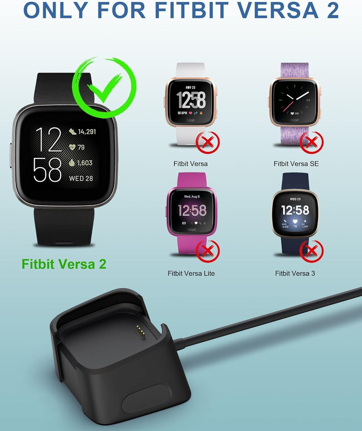 Q: Is this USB charger compatible with other Fitbit models?A: No, this USB charger is specifically designed for the Fitbit Versa 2. It is not compatible with other models such as Fitbit Versa or Versa Lite.