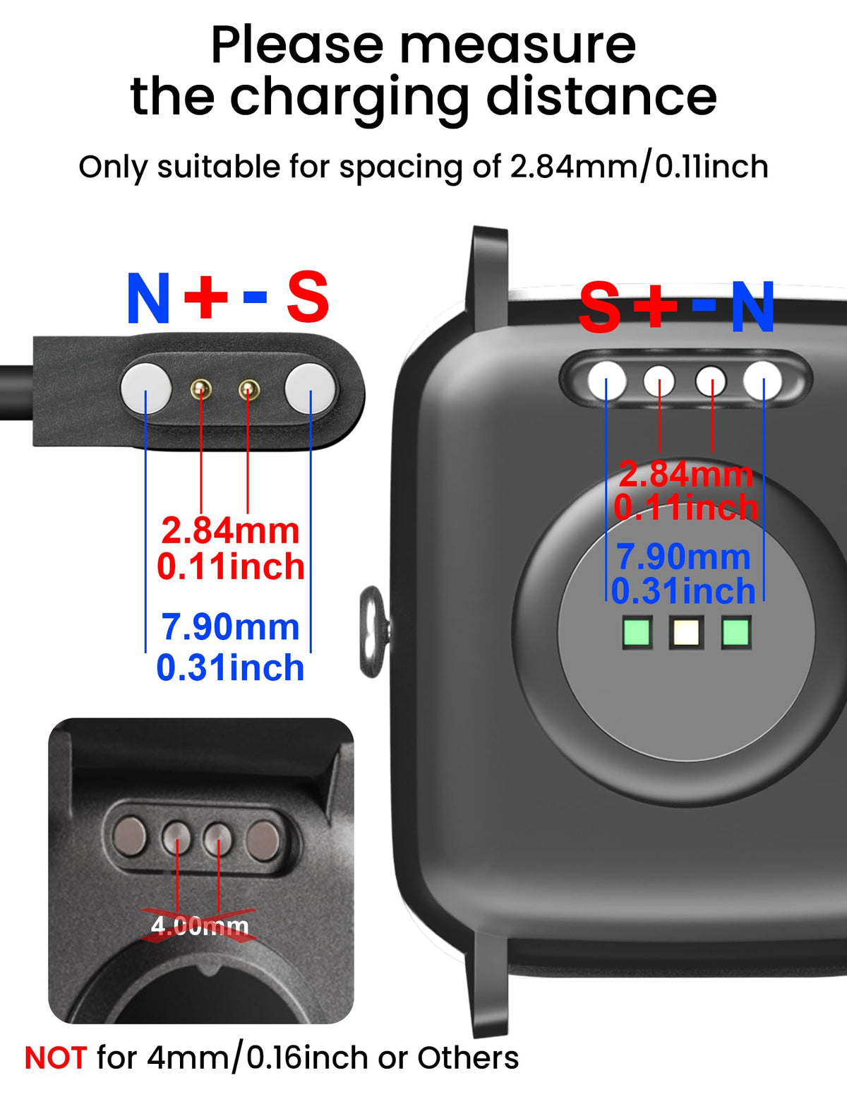 Dual Charging Cables: The package includes two charging cables - one black (S-+N) and one white (S+-N) with opposite polarity. This ensures compatibility with different smartwatch models. If one cable does not work, simply try the other to find the right fit.