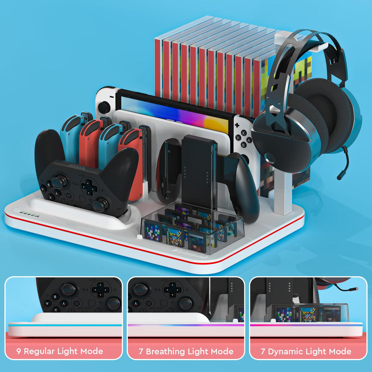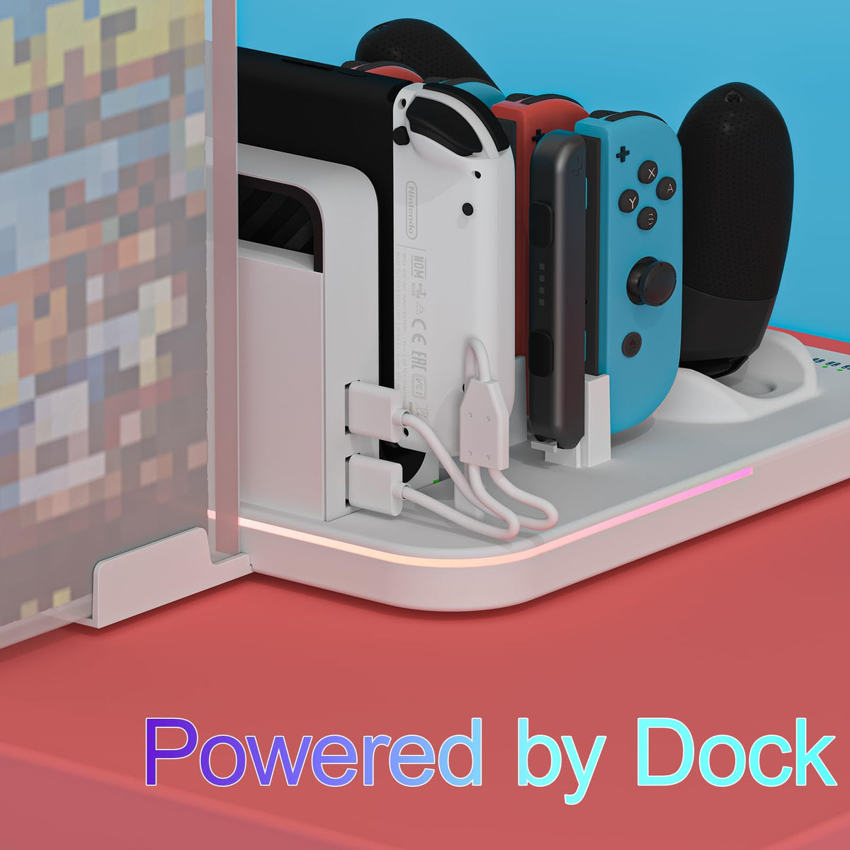 ?Vibrant Lighting Effects?Immerse Yourself In The Breathtaking Gaming Experience With Our Latest-Designed Switch Charging Dock. It Features A Mesmerizing Array Of 9 Different Colors And 6 Modes Of Rgb Lighting. Showcasing Fixed, Breathing, Gradient, Transition, Flickering, And Dual-Color Gradient Led Effects, This Dock Is Sure To Impress When You Display It. Additionally, The Charging Dock Comes With A Lighting Memory Function That Automatically Restores Your Preferred Settings When Reopened. | ?All-In-One Storage Stand?This Compact Switch Controller Charger Dock Charging, Storage, And Rgb Lighting All In One. It Can Accommodate A Complete Set Of 1 Dock (Regular Or Oled Version), 1 Pro Controller, 4 Joycon Controller, 12 Game Cards, 4 Wrist Straps, 1 Joycon Grip, 1 Headset, And 12 Game Card Cases. Keep Your Gaming Space Clean And Organized. When Not In Use, Conveniently Charge Your Professional Controller And Joy-Cons On This Stylish Dock. | ?Charging Functionality Status?Our Switch Joycon And Pro Controller Charger Dock Is Compatible With Both Switch And Oled Models. Powered By The Switch Dock, This Charging Dock Can Simultaneously Charge 4 Joycon Controllers And 1 Pro Controller, With Indicator Lights Displaying The Charging Status. A Red Light Indicates Charging In Progress, While A Green Light Signifies A Full Charge. It Also Helps You Tidy Up Your Controllers And Games. | ?Fast 3.5-Hour Charging?Compatible With Switch/Oled Models, This Dock Can Charge 1 Pro Controller And 4 Joycon Controllers Simultaneously. Connect The Charging Station To The Switch Dock Using The Included Usb-A To Type-C Cable, Then Charge The Switch Dock With A Standard Power Source (Not Included). The Pro Controller Can Be Fully Charged Within 4 Hours, While Four Joycon Controllers Can Reach Full Charge In Just 3 Hours. Please Note That It Only Supports Official Controllers And Cannot Guarantee Compatibility With Third-Party Ones. | ?Intelligent Switch Joy-Con Protection?Equipped With An Upgraded Intelligent Chip, This Joycon Charging Dock Prevents Overcurrent, Overvoltage, And Short Circuits, Providing Protection For Both Your Switch Charging Station And Devices. Once The Switch Charger Dock Is Fully Charged, The Green Light Stays On Continuously. You Can Confidently Charge Your Pro Controller And Joycon Controllers Overnight Without Worrying About Potential Damage. If You Own A Switch Console And Need A Charging And Storage Solution, This Dock Is Your Best Choice. Feel Free To Contact Us Anytime For Support And Assistance.