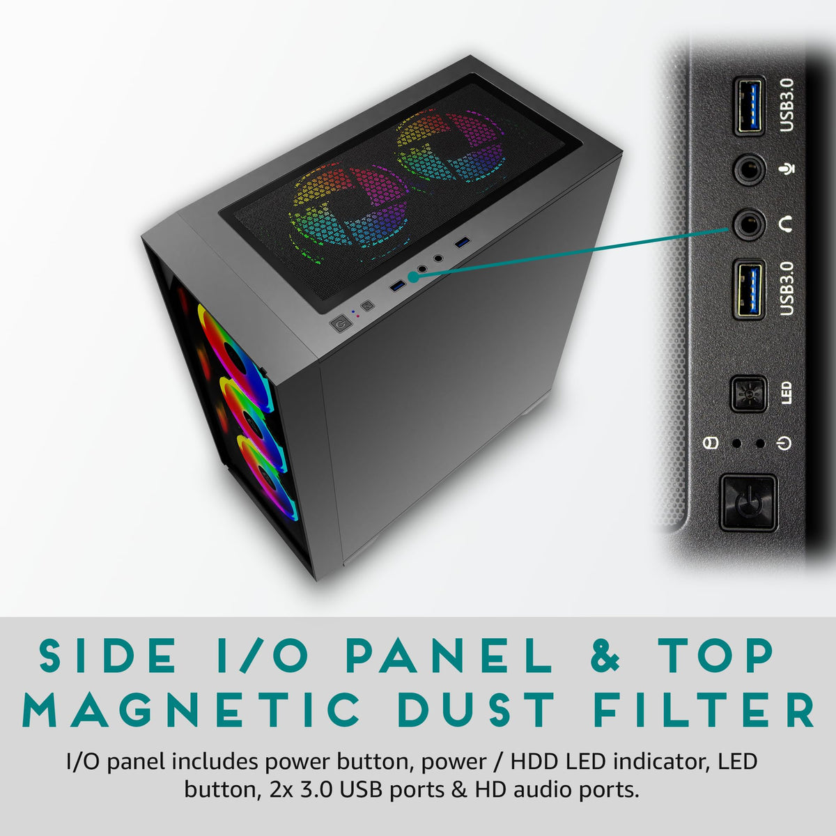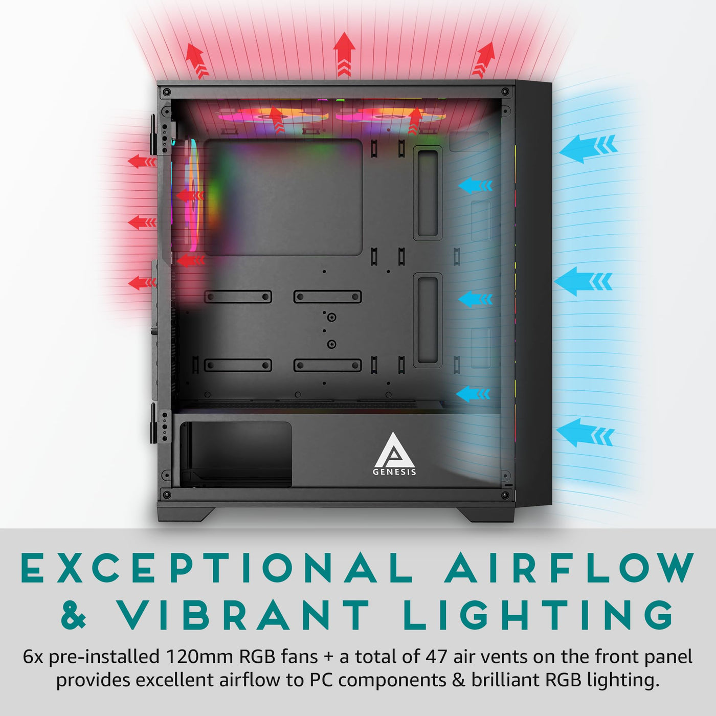Apevias Genesis Pro Line Of Computer Cases Brings Forth Both Function And Glamour To Your Pc Computer. With A Clear Tempered Glass Front Panel, It Shows Off Six Of Our Brilliant Rgb Fans; Three In The Front, One In The Rear, And Two In The Top. These Fans Glow Bright With Both An Inner As Well As An Outer Rgb Ring, And Come With 16 Color Modes Which Can Be Controlled By The Minimalist Led Button On The Top. The Top Panel Houses Two Usb2.0, One Usb3.0 And Audio Jacks For The Use Of External Devices. In Addition To The Front Window, The Genesis Also Comes With A Size Tempered Glass Side Panel For Easy Viewing Of Your Internal Setup While Hiding Your Power Supply From View. It Can Support Video Cards Up To 350Mm In Length Without Any Hassle. Show Off This Cool Case, Both In Style As Well As Ventilation As The Front Glass Is Raised Allowing Cool Air To Enter Unimpeded.