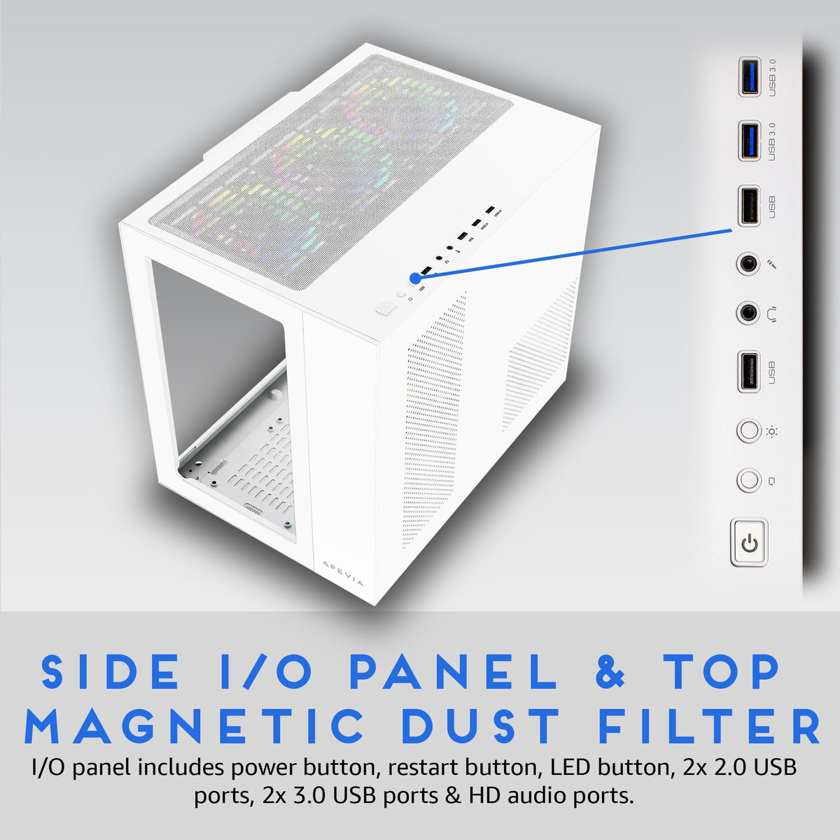 The Apevia Prism Elite Mid Tower Series Allows Gamers To Play With Confidence Through Its Fascinating Case Style, Premium Features, And Performance Functionality. With The Dual Tempered Glass Panels, It Shows Off 7 Vibrant 120Mm Pwm Argb Fans That Provide Excellent Airflow-Three On The Top, Three On The Side, One In The Rear. Radiating A Brilliant Glow With Inner And Outer Rgb Rings, These Fans, With A 3Pin Argb Connector, Sync Seamlessly With Argb Software For Compatible Motherboards. Even Without Such A Motherboard, Gamers Can Enjoy 366 Dazzling Rgb Color Modes. Control The Rgb Lighting With An Easy Led Button On The Top Panel-Hold Down The Led Button For 5 Seconds To Effortlessly Switch Between The 366 Rgb Modes And Argb Motherboard Sync. By Connecting The 4Pin Pwm Cable From The Argb Fans To The Motherboard, Gamers Can Optimize The Fan Speed To Their Preference For Full Flexibility And Functionality. The Top Panel Features Practical Connections: 2X Usb 3.0 Ports, 1X Usb Ports, Power Button, Led Button, And Hd Audio Jacks For External Devices. With The Ability To Support 240Mm/280Mm/360Mm Radiators, Gamers Can Comfortably Install Large Water Cooling Aio'S To Make Their Setup Even More Spectacular. The Matching Paint Colors On The Exterior, Interior, And Case Fans Define The Apevia Prism Elite'S Premier Appearance. Supporting Graphics Cards Up To 400Mm, Gpu Installation Is As Easy As It Gets With The Removable And Reuseable Screw-In Pci-E Covers. Available In Black, White, And Pink Color Options