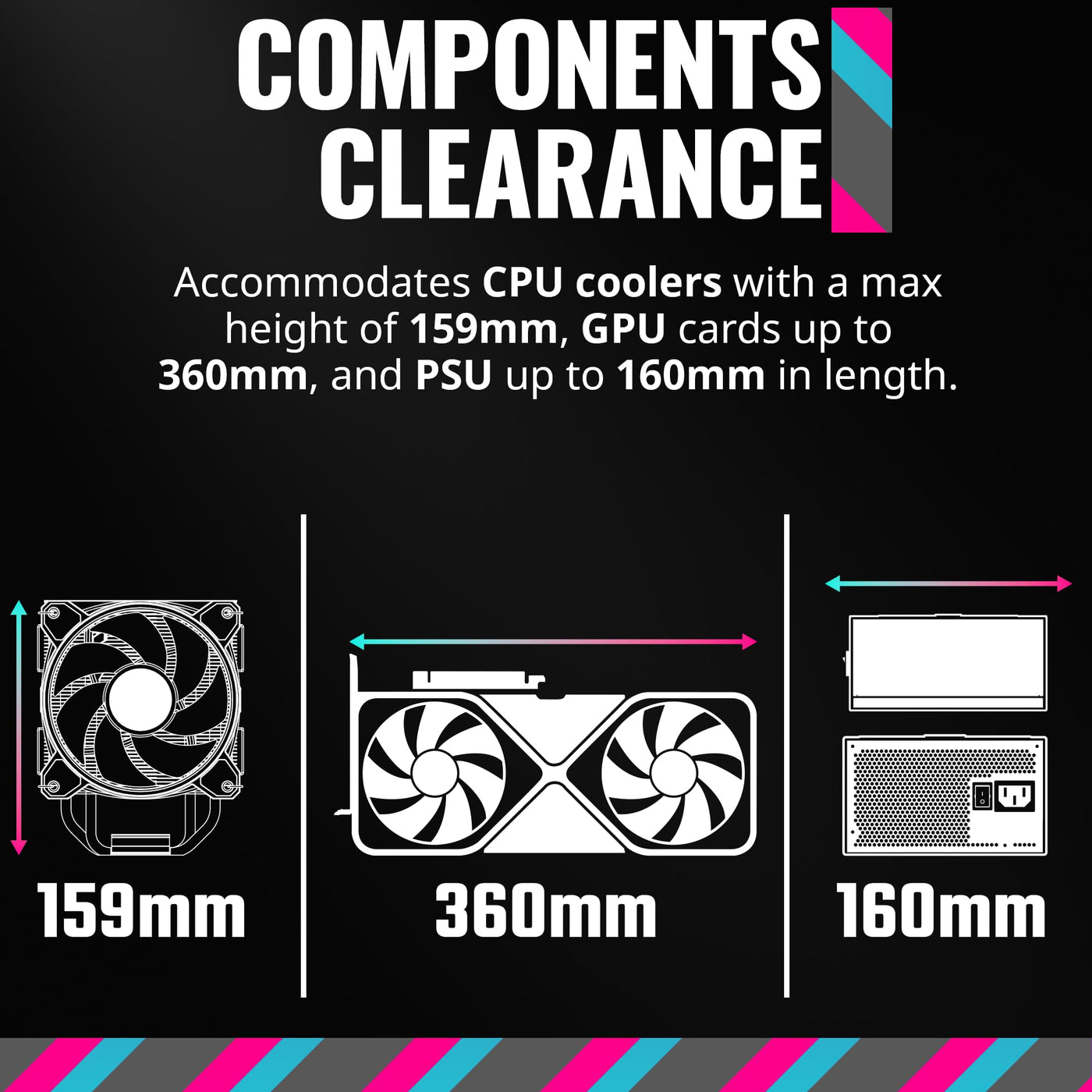 Q: What is the maximum GPU size that the Cooler Master MasterBox Q300L can accommodate?A: The Cooler Master MasterBox Q300L can accommodate GPU cards up to 360mm in length, allowing for a wide range of graphics card options.