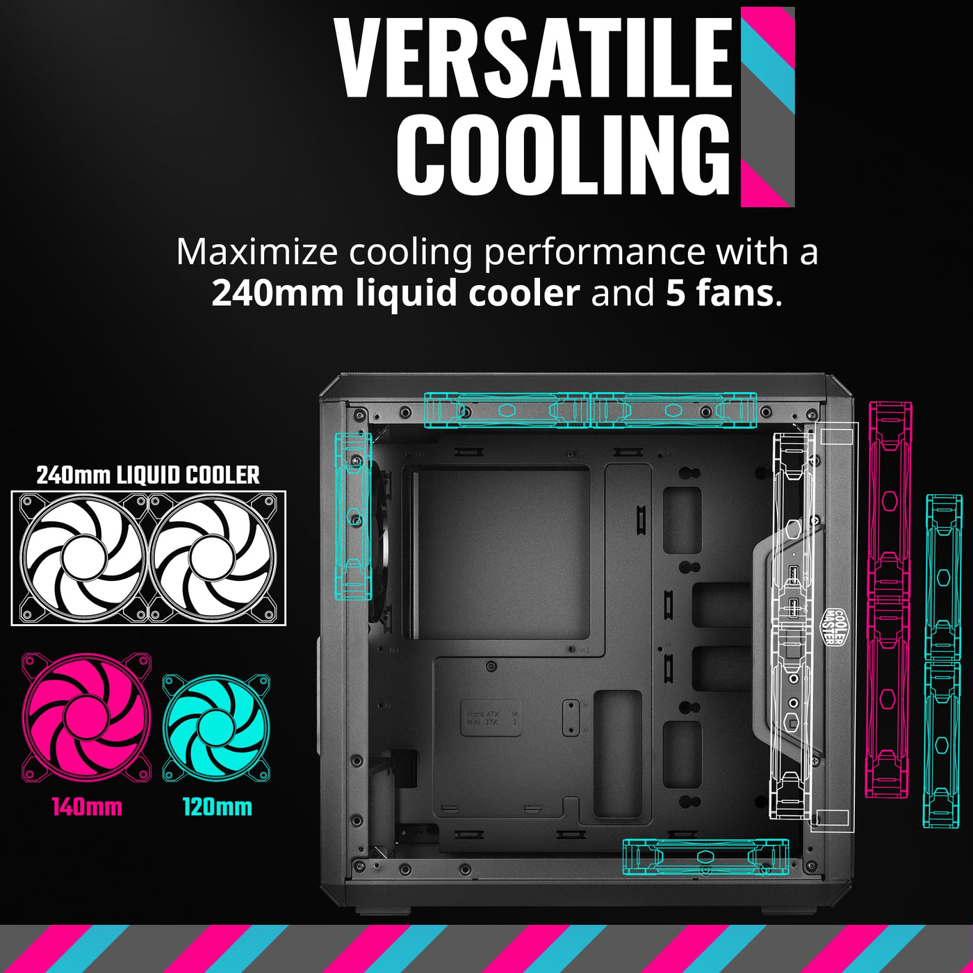 Q: How effective is the cooling system in the MasterBox Q300L?A: The MasterBox Q300L features an open thermal design that promotes optimal airflow and heat dissipation, accommodating up to a 240mm liquid cooler and up to five fans for enhanced cooling performance.