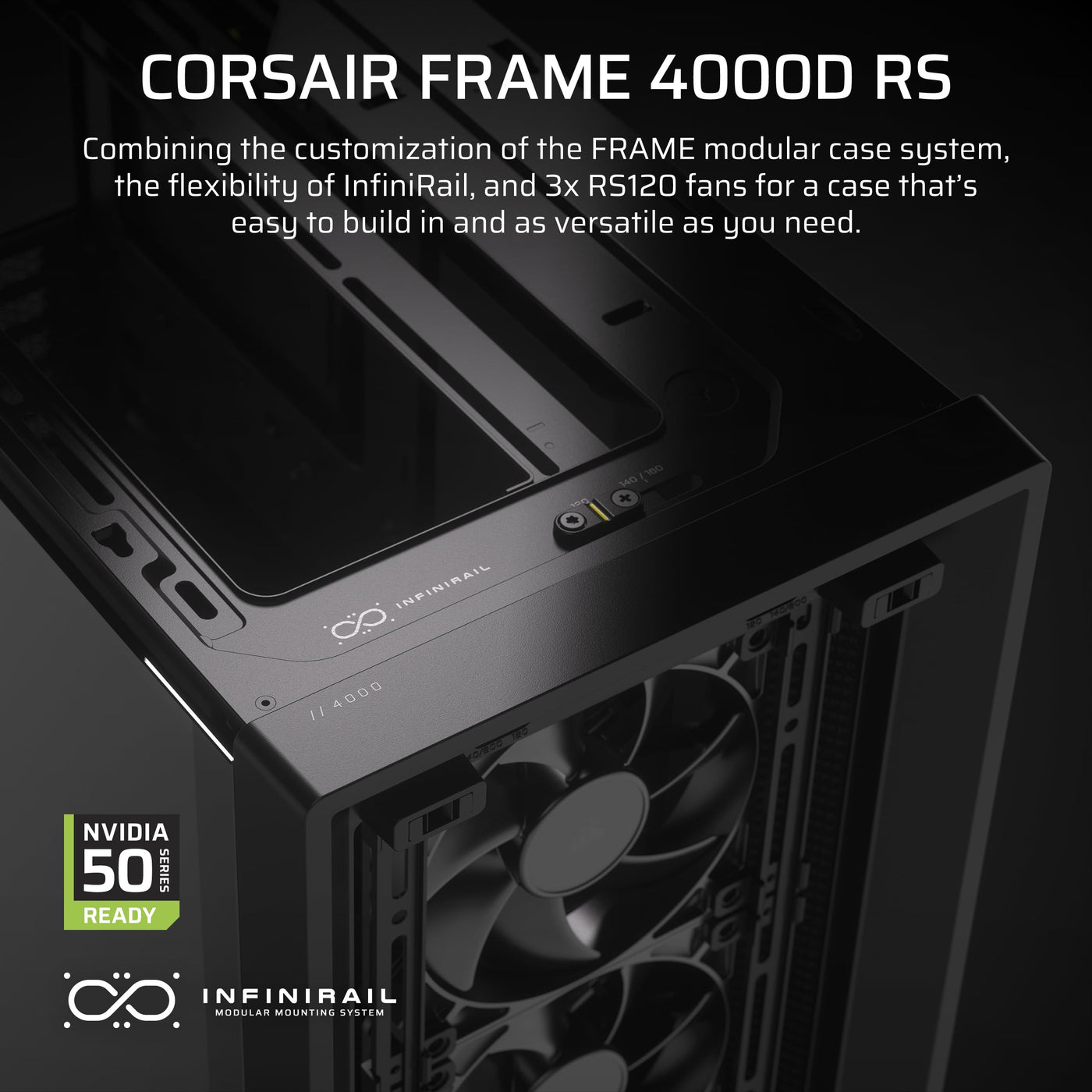 Free Yourself From The Constraints Of Traditional Pc Building With The Corsair Frame 4000D Rs, Featuring The Innovative Frame Modular Case System To Perfectly Customize Your Build. Includes 3X Corsair Rs120 Pwm Fans With Daisy-Chainable 4-Pin Connectors. The Infinirail Mounting System Simplifies Fan Installation, Supporting Dual 360Mm Radiators And A 3D Y-Pattern Airflow Front Panel For Optimal Cooling. The Increased Width And Length Ensure Compatibility With Powerful Graphics Cards And Cooling Options, With Support For Reverse Connection Motherboards. We Provide The Frame. You Create The Art.