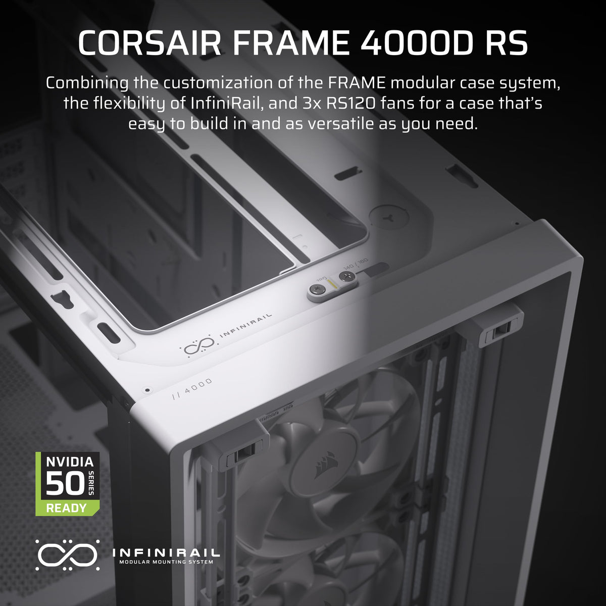 Free Yourself From The Constraints Of Traditional Pc Building With The Corsair Frame 4000D Rs, Featuring The Innovative Frame Modular Case System To Perfectly Customize Your Build. Includes 3X Corsair Rs120 Pwm Fans With Daisy-Chainable 4-Pin Connectors. The Infinirailmounting System Simplifies Fan Installation, Supporting Dual 360Mm Radiators And A 3D Y-Pattern Airflow Front Panel For Optimal Cooling. The Increased Width And Length Ensure Compatibility With Powerful Graphics Cards And Cooling Options, With Support For Reverse Connection Motherboards. We Provide The Frame. You Create The Art.