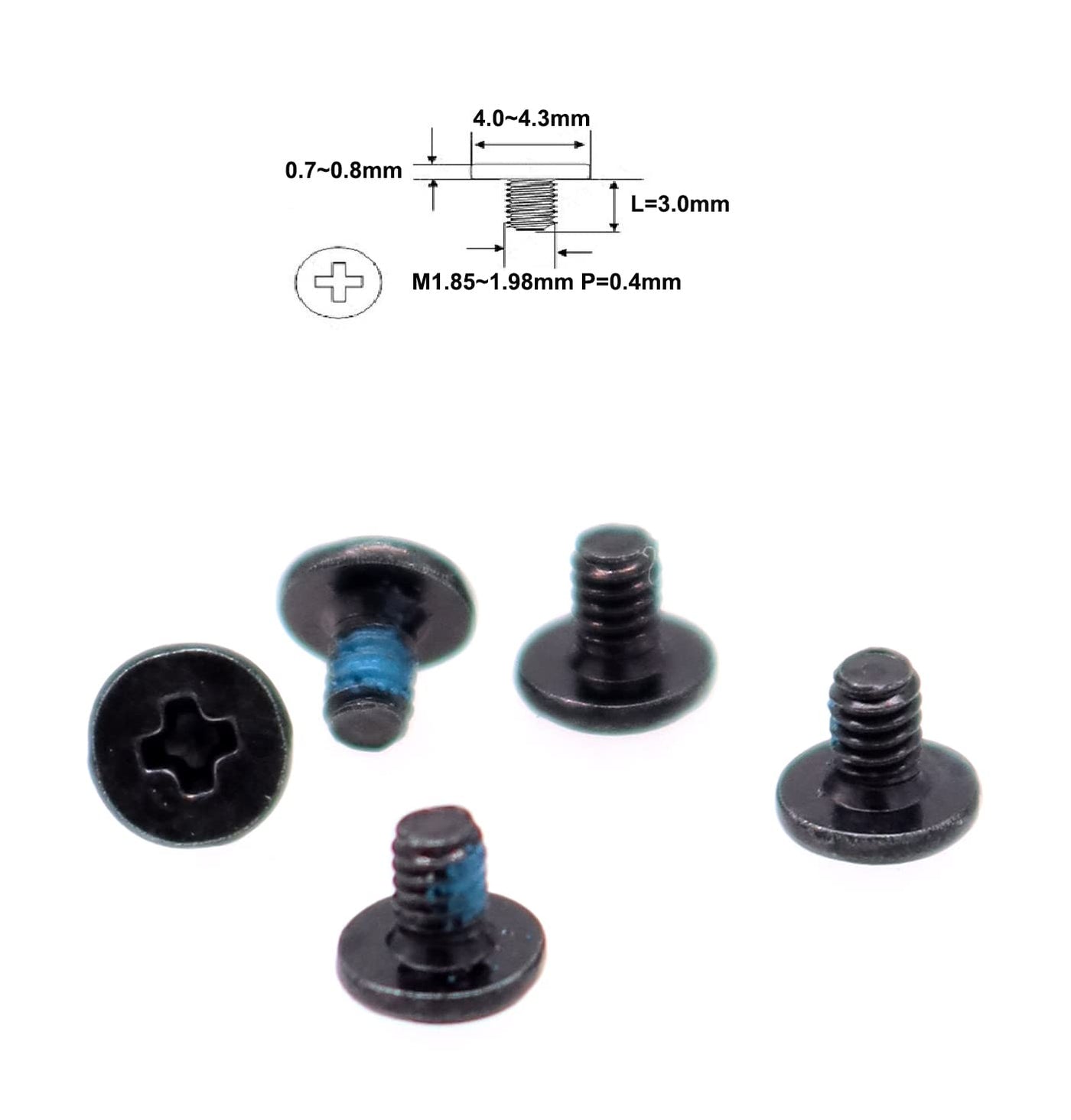 This Is The Little Screw Mainly Used On Laptop, Wifi Cards, M.2 Ssd Nvme Heatsink, Screen Brackets, Multi I/O Boards, Cooling Fan, Webcams, Keyboards, And Even Some Palmrests And Base Plastics. Specification: Material: Steel Finish: Nickel Plated Groove Type: Phillips Thread Shoulder Diameter: 1.85~1.98 Mm Shoulder Length(Not Included Head): 3.0 Mm Head Diameter: 4.0~4.5 Mm Thread Pitch: 0.40 Mm Head Thickness (Head Height): 0.7~0.8 Mm Color: Black