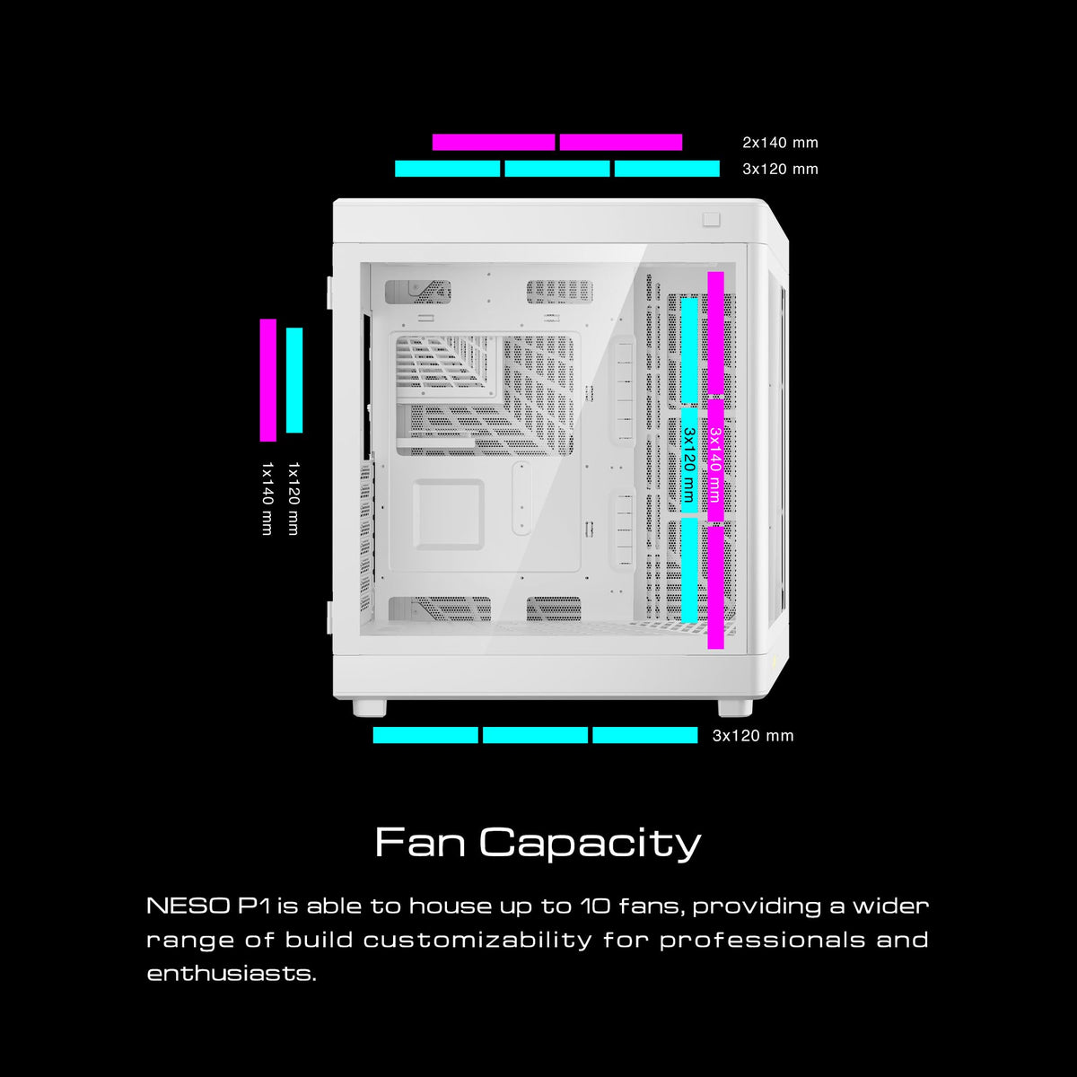 'Radiator Support Top: 360Mm ;280Mm / Side: 360Mm;420Mm / Rear: 120Mm Fan Support Top: 3 X 120Mm;2 X 140Mm / Side: 3 X 120Mm; 3 X 140Mm / Rear: 1 X 120Mm / Bottom: 3 X 120Mm Drive Bays 2 X 3.5; Or 1 X 2.5;+1 X 3.5;(Hdd Cage) 2 X 2.5;(Hdd Cage) + 3 X 2.5'' (Ssd Bracket) I/O Port Usb 3.0 X2, Type C X 1, Hd Audio X1, Led Control X1 Clearance Cpu Cooler Height Limitation:193Mm Vga Length Limitation:426Mm Vga Width Limitation: 192Mm Psu Length Limitation:180Mm''