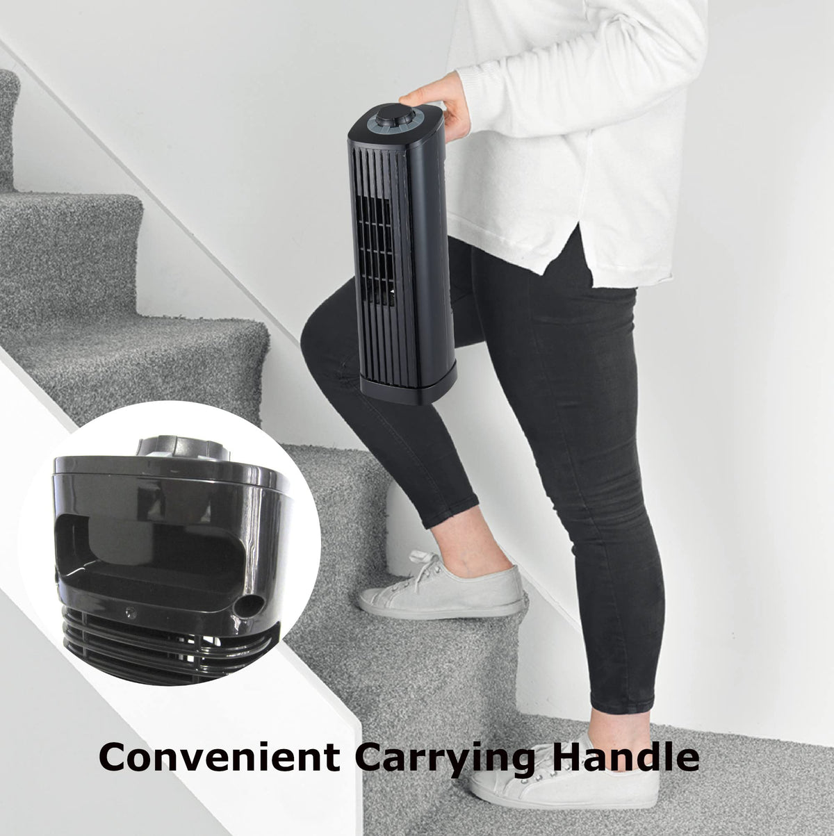 Need Cooling On The Go? The Optimus 3-Speed 14-In. Portable Ultra-Slim Desktop Oscillating Tower Fan In Black Is A Smart, Safe, And Convenient Way To Cool Down During Hot Summer Months. This Oscillating Fan Is Designed With A Narrow Footprint So It Can Easily Fit On Your Desk, Tabletop, Or In The Corner Of A Room. But Don'T Let Its 14 In. Height Fool You. With 3 Swing Settings With A Max Of 70 Oscillation, The Fan Not Only Provides Comprehensive Coverage To A Specific Place, But Also Assures A Well-Ventilated Room. It'S Also Amazingly Portable, Thanks To Its Convenient Carrying Handle And A Light Weight Of Just 2.06 Lbs.