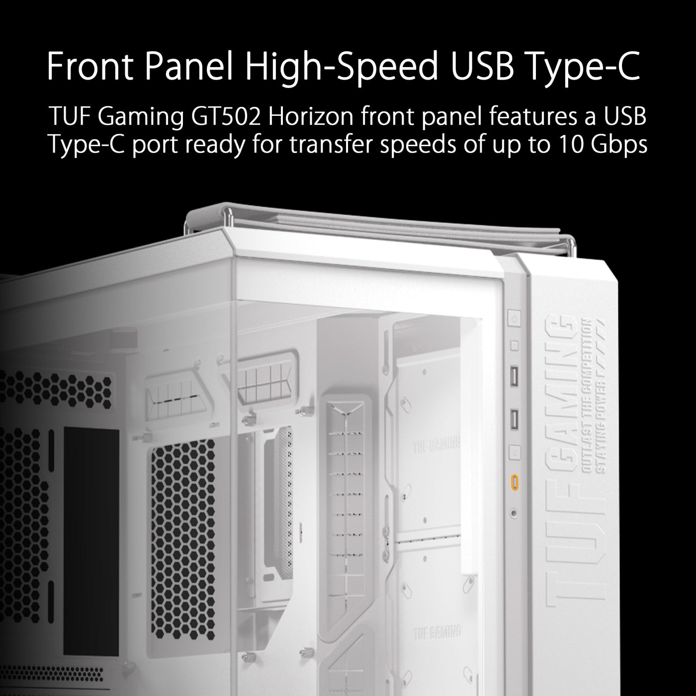 Q: What type of front panel connectivity does this case offer?A: The ASUS TUF Gaming GT502 Horizon is equipped with a front panel USB 10 Gbps Type-C port, which provides high-speed data transfer capabilities, making it convenient for connecting modern devices.