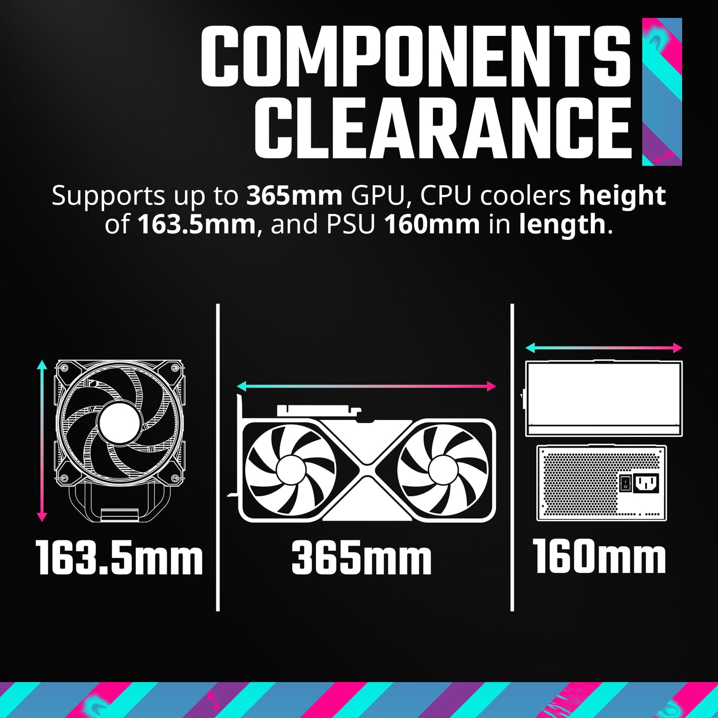 Q: What is the maximum GPU length supported by the Cooler Master Elite 301?A: The Cooler Master Elite 301 supports GPUs up to 365mm in length, providing ample space for high-performance graphics cards.