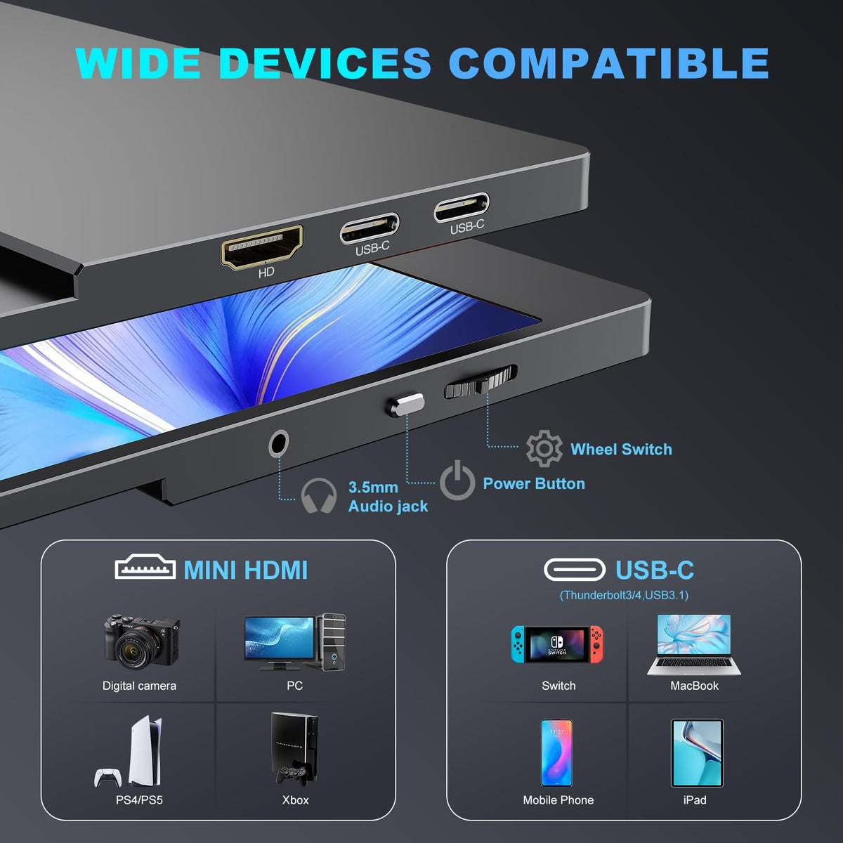 Q: What devices are compatible with the Portable Monitor for Laptop?A: The Portable Monitor for Laptop is compatible with a variety of devices, including laptops, consoles like PS4 and PS5, Xbox, tablets, and smartphones. It features dual USB-C and HDMI ports for easy connectivity.