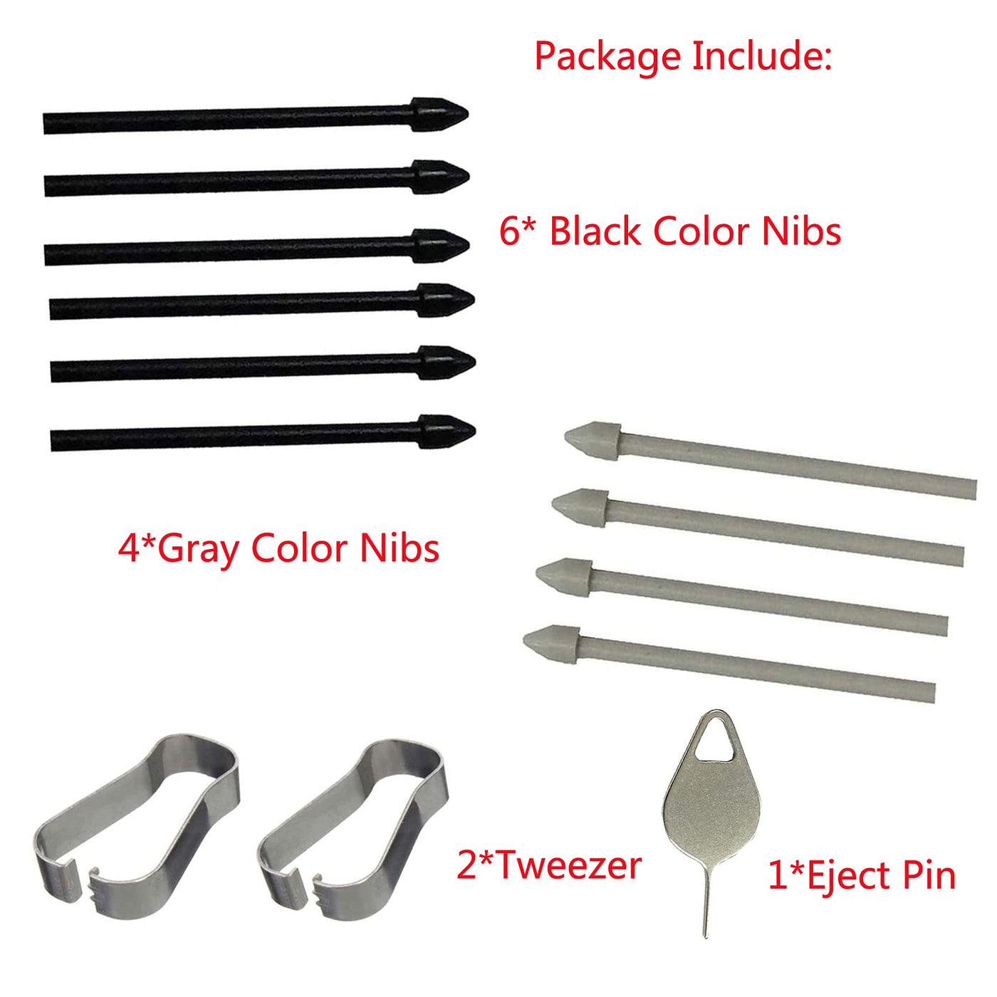 Q: What is included in the package of the stylus nibs?A: The package includes 6 white nibs, 4 gray nibs, 2 removal tweezers, and 1 eject pin for easy installation and replacement.