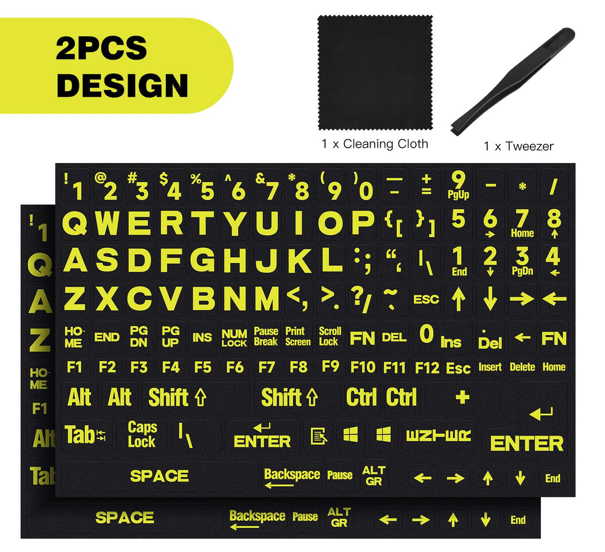 Imcomor 2Pcs English Keyboard Stickers, Universal Computer Laptop Replacement Large Keyboard Stickers Big Bright Yellow Lettering For Sight Impaired, Keyboard Alphabet Stickers For Laptop Pc Computer Notebook Keyboards. A Perfect Christmas Gift And New Year Gift For Your Family And Friends. The English Computer Laptop Keyboard Stickers (English) Are Especially Designed For Any Keyboards And Perfectly Fit For Desktops, Which Include Pcs Like Imac, Acer, Dell, Emachines, Hp, Ibm, Gateway, Macintosh Computers, Sony, Asus, Averatec, Compaq, Nec, Power Mac, Samsung, Sharp, Systemax, Etc. Product Size: 215Mm X 145Mm (8.46In X 5.7In) Small Sticker Size: 11.5Mm X 13Mm (0.45In X 0.51In) Color: Yellow Lettering With Black Background Package Included: 2 X Replacement Keyboard Stickers (English) Our Service We Promise Our Product With High Level Quality. Please Contact Us If You Have Any Problems, Issues Or Questions. We Will Offer You Our Best Service To Make You Satisfied With Our Product.