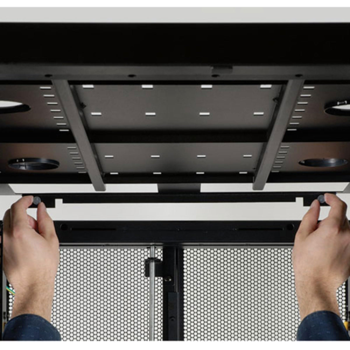 Q: How does the airflow optimization work in the SR45UB cabinet?A: The SR45UB features a perforated door design that provides over 65% open space for airflow, promoting efficient cooling. Additionally, the vented top panel helps to remove warm air while drawing in cooler air.