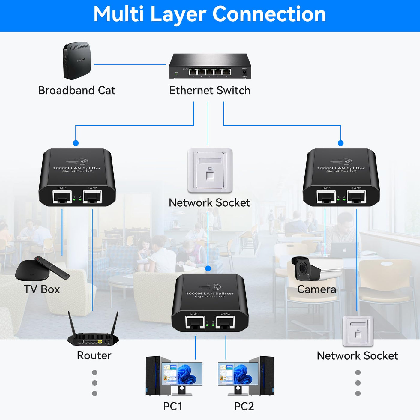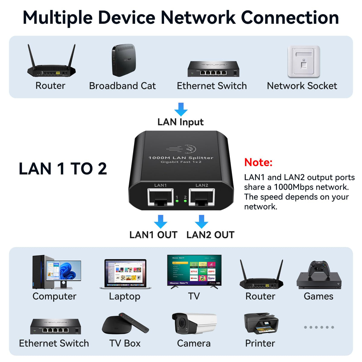 ?Internet Splitter 1 In 2 Out?Internet Splitter High Speed Can Expand One Gigabit Ethernet Port To Connect Two Computers, And Both Computers Access The Internet At The Same Time , And Supports Cascading To Help You Expand Network Ports. Lan Splitter Can Transfer Large, Bandwidth-Intensive Files Without Interruption. Through The Network Splitter, You Can Reduce The Frequent Plugging And Unplugging Of Cables And Protect Your Equipment. In Order Not To Affect Your Network Quality, Please Use Cat6. | ?Gigabit Ethernet Splitter?This Ethernet Splitter 1 To 2 High Speed Can Gigabit Ethernet Network Connection (1000M) Via Cat6 Cable, Gives You Lightning-Fast Data Transfer Speeds. High-Speed Transfer Speeds Allow You To Work More Efficiently And Surf The Internet More Fun. Note: Two Computers Can Only Share 1000M Network Bandwidth, And One Computer Supports A Maximum Of 1000M When Connected, This Speed Data Is The Maximum Value Of The Chip, And The Actual Speed Is Subject To The Connected Device. | ?Wide Compatibility?The Rj45 8P8C Lan Internet Splitter Is Compatible With Various Network Cable Types, Including Cat6, Cat7, Cat8, Cat5, And Cat5E. It Can Be Used With A Range Of Devices Such As Adsl, Hubs, Switches, Tvs, Set-Top Boxes, Routers, Wireless Devices, And Computers. For Optimal Network Stability, Cat6 Network Cable Is Recommended. | ?Stable Work?The Splitter Is Lightweight And Durable And Comes With A 0.8 Meter Usb Charging Cable, It Is Recommended To Connect To A Usb Power Adapter Rather Than A Laptop As This Optimizes Stability And Performance During Use. Please Note: The Product Must Be Connected To A Power Source For Effective Work. | ?Aftermarket Service?Ethernet Splitter Supports Various Network Devices With High Compatibility. Within 24 Months After Purchase, If You Encounter Any Problems During Use, Please Contact Us. Our Professional After-Sales Service Team Will Handle It Within 24 Hours. Provide Technical Support And New Replacement Service As Well As Refund Service.