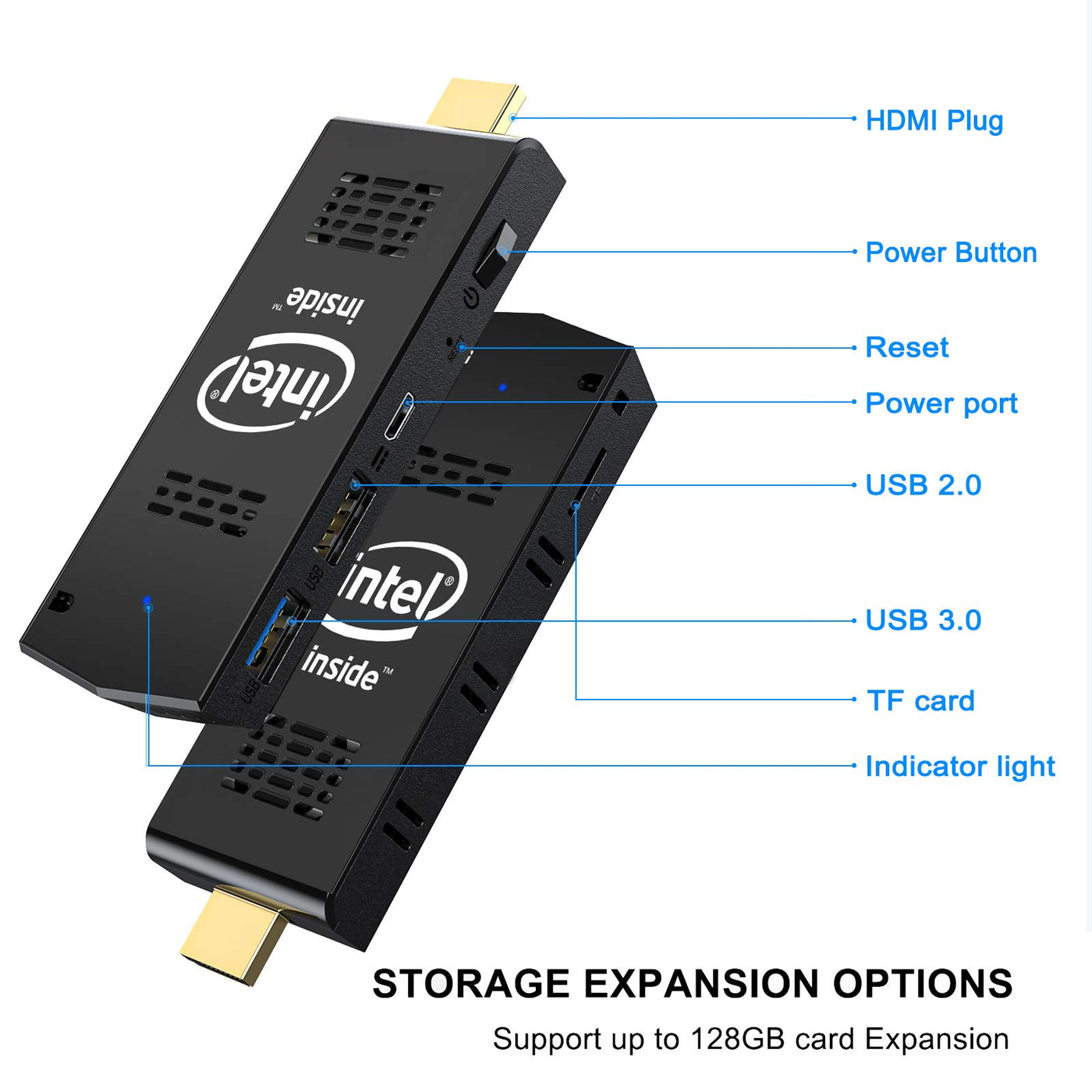 Tips To Better Use This Mini Pc Stick: 1. This Pc Stick With 8Gb Rom 128G Ram For Convenient Storage 2. Uninstall Any Program Or App That Isn'T Needed Or Used. Once Done, There Was Enough Space To Update Windows. 3. If You Need To Trun Off The Mini Pc .Please Click ''Turn Off''On The Interface Rather Than Unplug The Power Cable From The Socket Directly. Processor Cpu: Intel Atom X5-Z8350 Processor Base Frequency:1.44 Ghz Burst Frequency: 1.92 Ghz Cache: 2 Mb Cores: 4 Storage Memory Size: 8Gb Memory Types: Ddr3L Hard Disk: 128Gb Processor Graphics Gpu: Intel Hd Graphics 400 Graphics Base Frequency: 200 Mhz Graphics Burst Frequency: 500 Mhz I/O Specifications Usb: 1X Usb 3.0,1X Usb 2.0 Video Interface: 1X Hdmi 1X Micro Sd Card Slot 1X Dc Power Port 1X Power Key 1X Reset Wireless Technology Wi-Fi: 2.4G/5G Built-In Wifi Bluetooth: Bt 4.2 Package List 1X Mini Pc Stick 1X Power Adapter 1X Hdmi Cable 1X User Manual