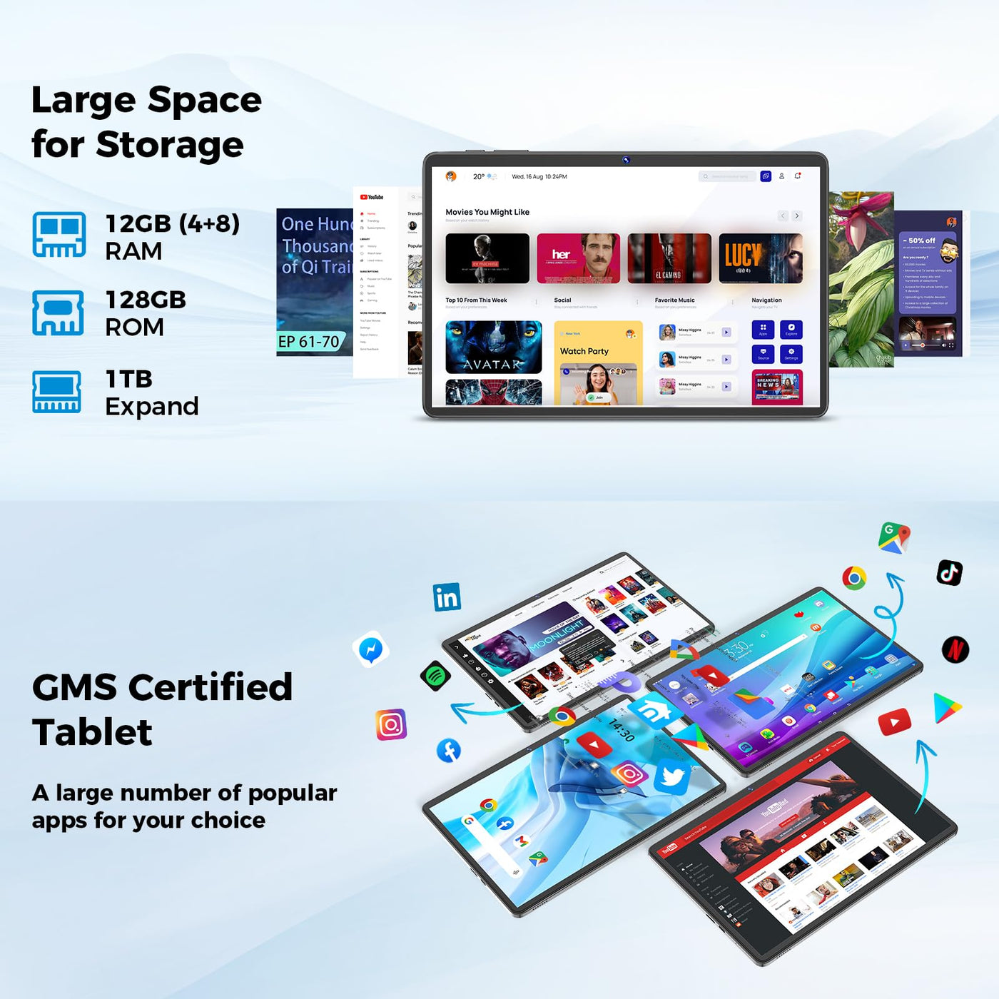 Specifications: Battery: 8000 Mah/Li-Ion Battery Working Time: 17 Hours Screen: 11 Inch Ips 1280*800 Fhd Ram: 12(4+8)Gb Rom: 128 Gb Maximum Expansion: 1 Tbos: Android 14.0 Wi-Fi & Bt: 5G Wifi & 2.4G Wifi+ Bluetooth V5.0 Dual Camera: Front 5Mp + Rear 13Mp