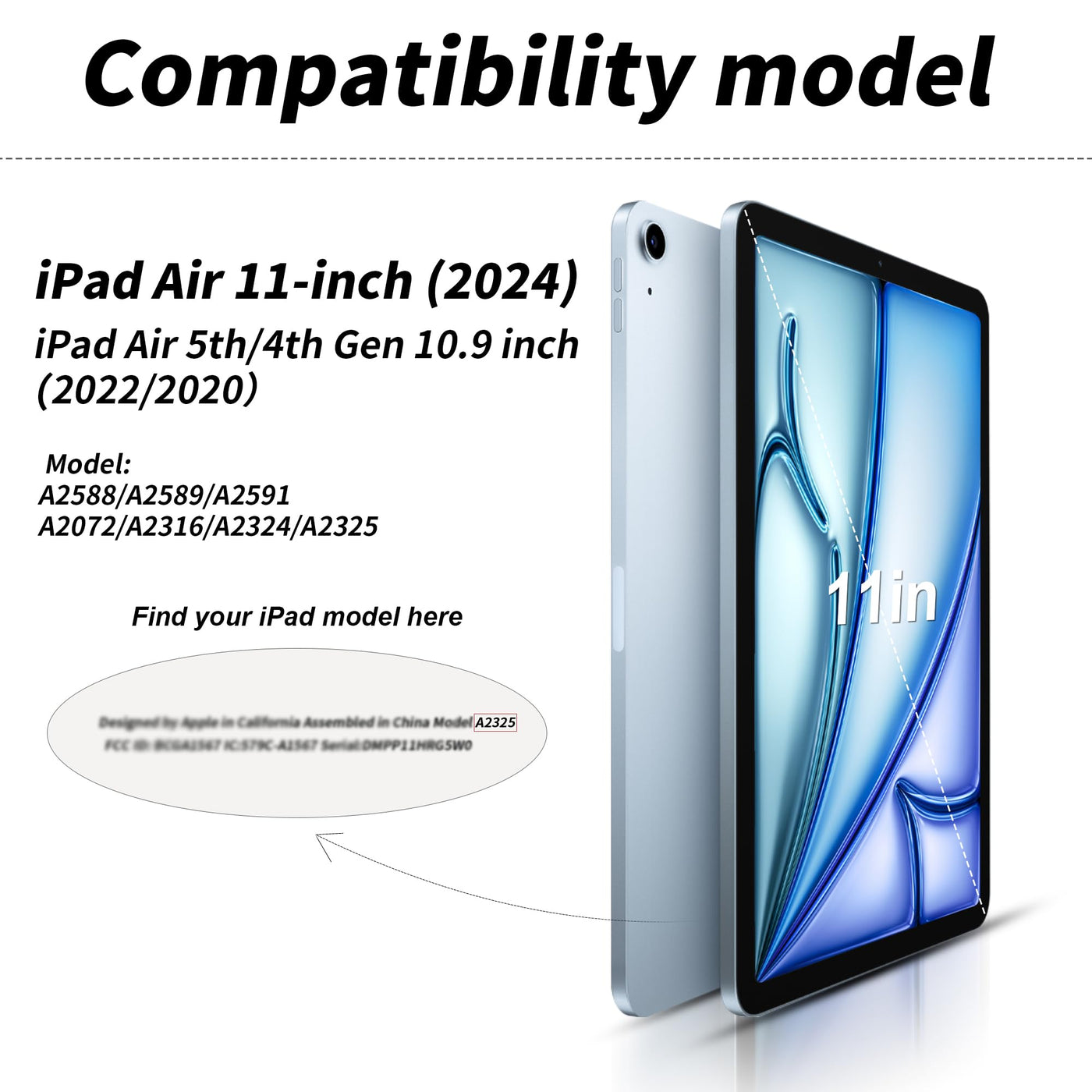 Q: Is the Aoub Case compatible with my iPad model?A: The Aoub Case is designed specifically for the iPad Air 11-inch M2 (2024) and the iPad Air 5th/4th Generation (2022/2020) 10.9-inch models. Please check the back bottom of your iPad for model numbers A2589, A2591, A2588, A2324, A2072, A2316, or A2325 to ensure compatibility.