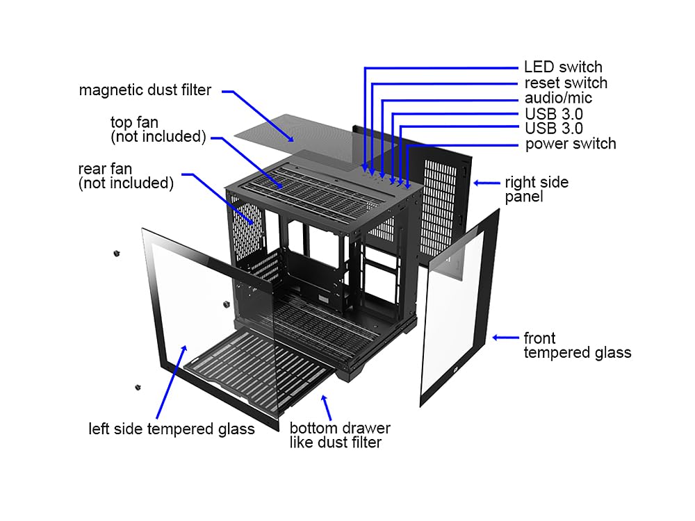 Bluegears Bgears B-Pellucid Microatx Gaming Pc Case. Unobstructed Crystal-Clear Infinity View Tempered Glass Design From Front To Side Panel. Accommodate Up To 7 Fans For Massive Air Cooling Effect And To Show Off Your Gaming Rig By Adding Argb Fan Lighting Effect (Fan Not Included). Compact Micro Atx Tower Yet With Spacious Interior To Accommodate Gpu Length Up To 330Mm, Power Supply Up To 160Mm Depth, Cpu Heatsink Up To 157Mm Tall, And Support 240 Radiator On Top Panel. Built-In Usb3.0 X 2 Ports. Support 1 X 3.5 Hdd Or 2 X 2.5 Ssd. Support Microatx, And Mini Itx Motherboards. Removable And Washable Magnetic And Drawer-Like Dust Filter On Top And Bottom Respectively. Fans Are Sold Separately!! Highly Recommend B-Argb Dualring 120 And 140Mm Fan As Shown In Photo, For Ultimate Argb Lightning Effect. Customer Service Support@Bgears.Com Or Call 702-988-6808 Rma Service Rma@Bgears.Com Or Call 702-988-6808