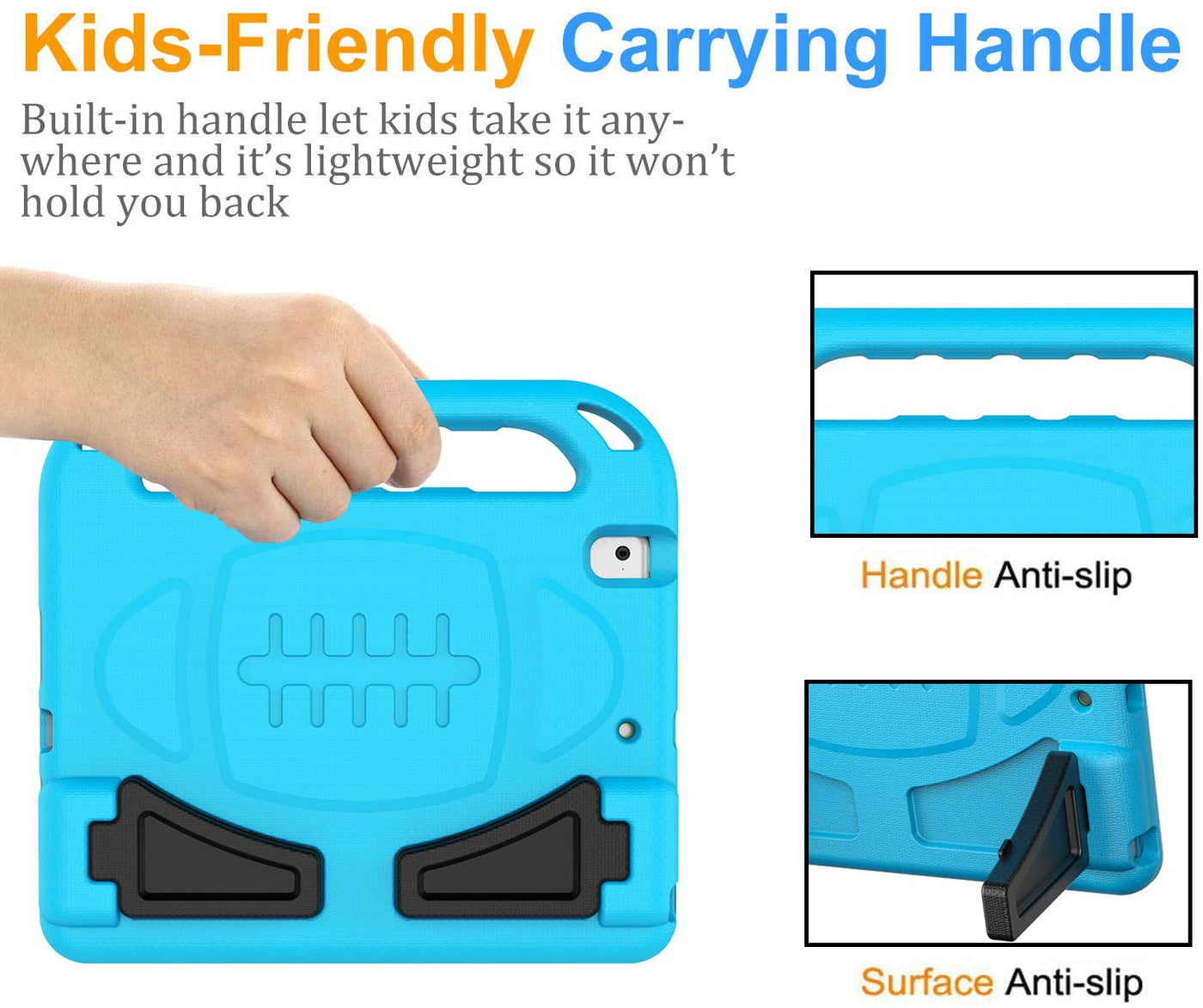 Q: How does the built-in kickstand enhance usability?A: The built-in kickstand provides two viewing angles, making it easier for kids to watch videos, type, or play games, whether at home or on the go.