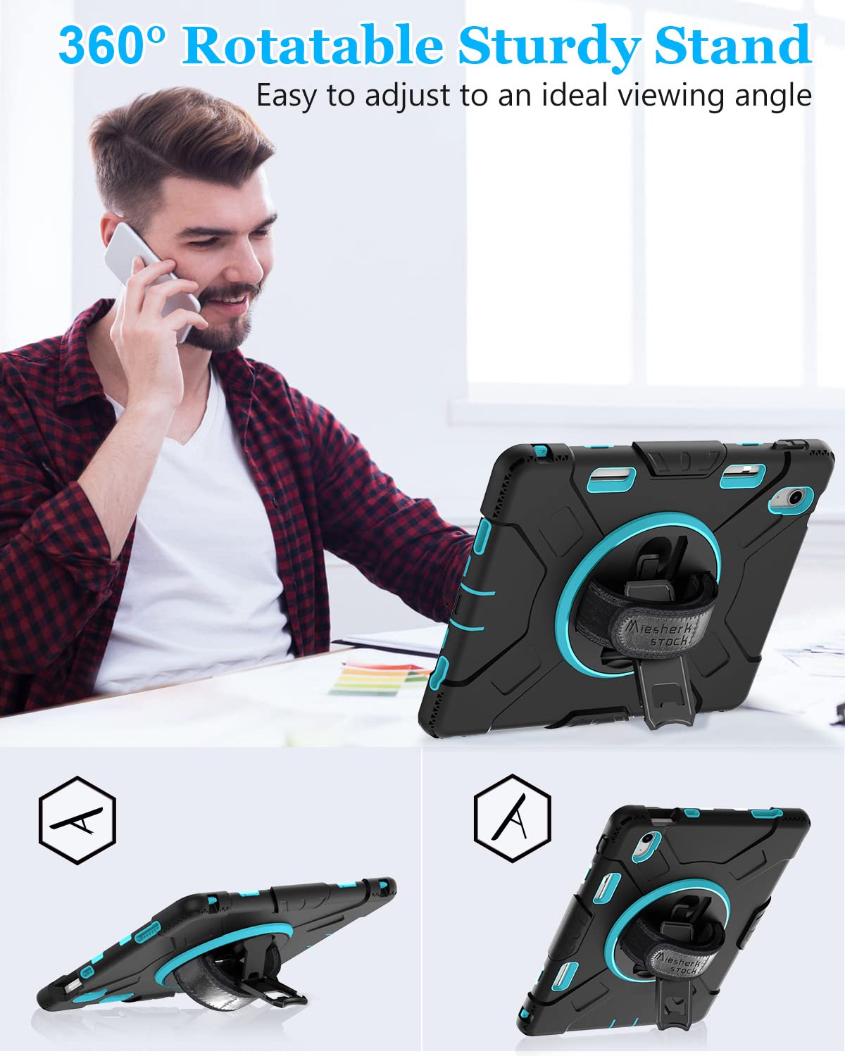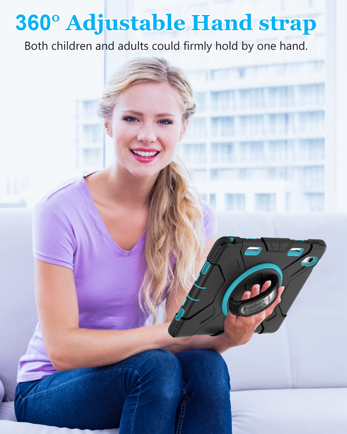 Q: What features does this iPad case offer for protection?A: The case features a military-grade drop protection system, with a hard PC inner cover and a silicone outer layer. It has passed the Military Grade Drop Test (MIL-STD 810G-516.6) and can withstand shocks and drops from up to 15 feet.