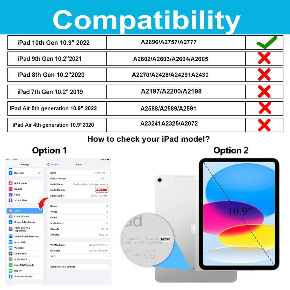 Q: Is this case compatible with the iPad 10th Generation 2022?A: Yes, this case is specifically designed for the iPad 10th Generation 2022 (models: A2757, A2777, A2696). Please confirm your model number before purchasing to ensure a perfect fit.