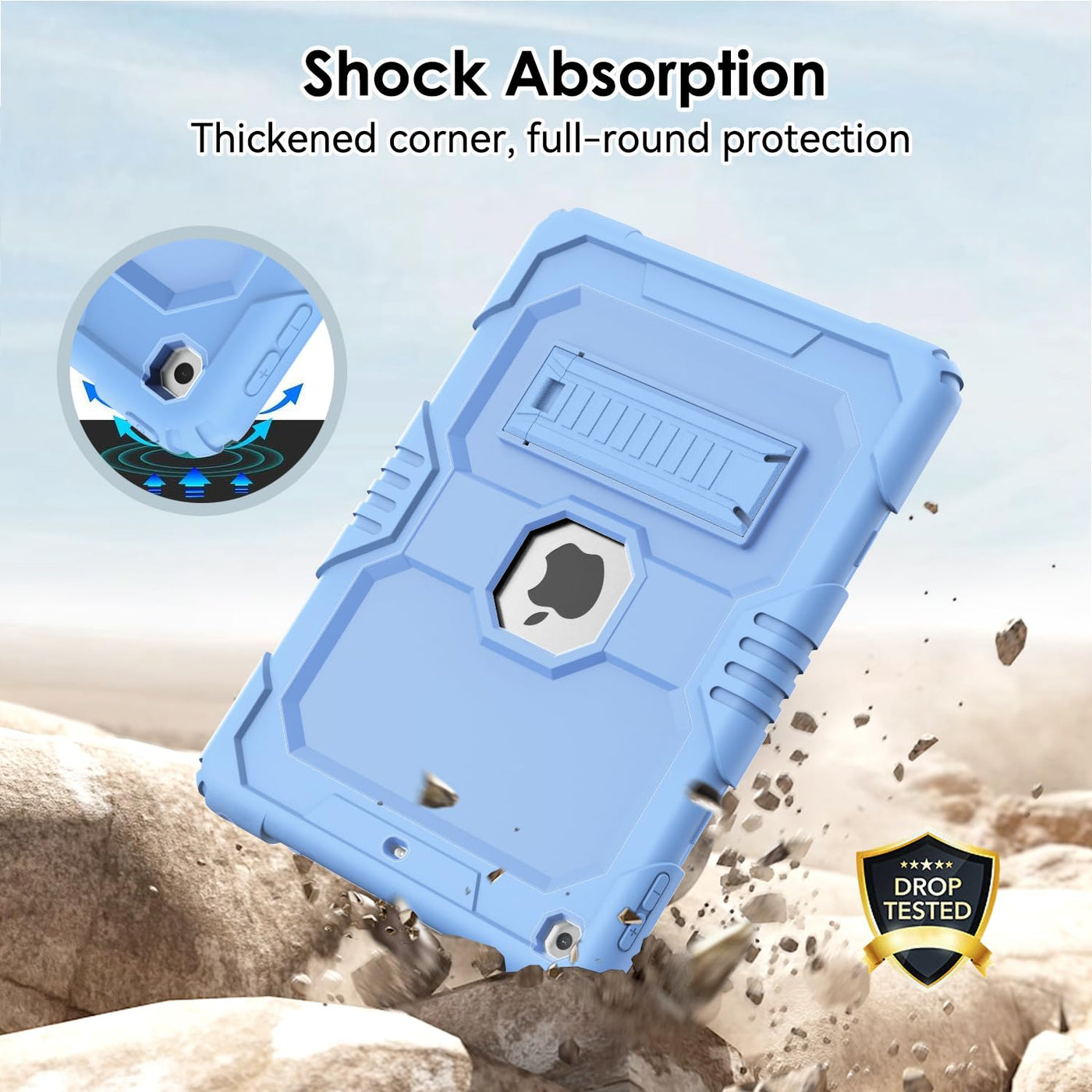 Q: What kind of protection does this case offer?A: The case features a 3-IN-1 shock-absorbing protective structure, combining a rugged hard PC with a durable silicone outer layer to safeguard your iPad from accidental drops, bumps, shocks, and scratches.