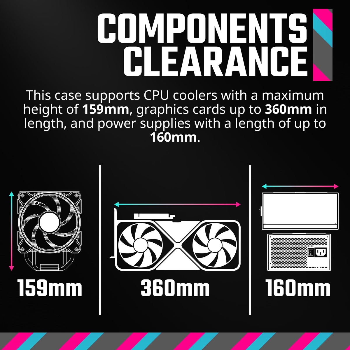 Q: What is the maximum CPU cooler height supported by the Cooler Master Q300L V2?A: The Cooler Master Q300L V2 supports CPU coolers with a maximum height of 159mm, allowing for a variety of cooling solutions.