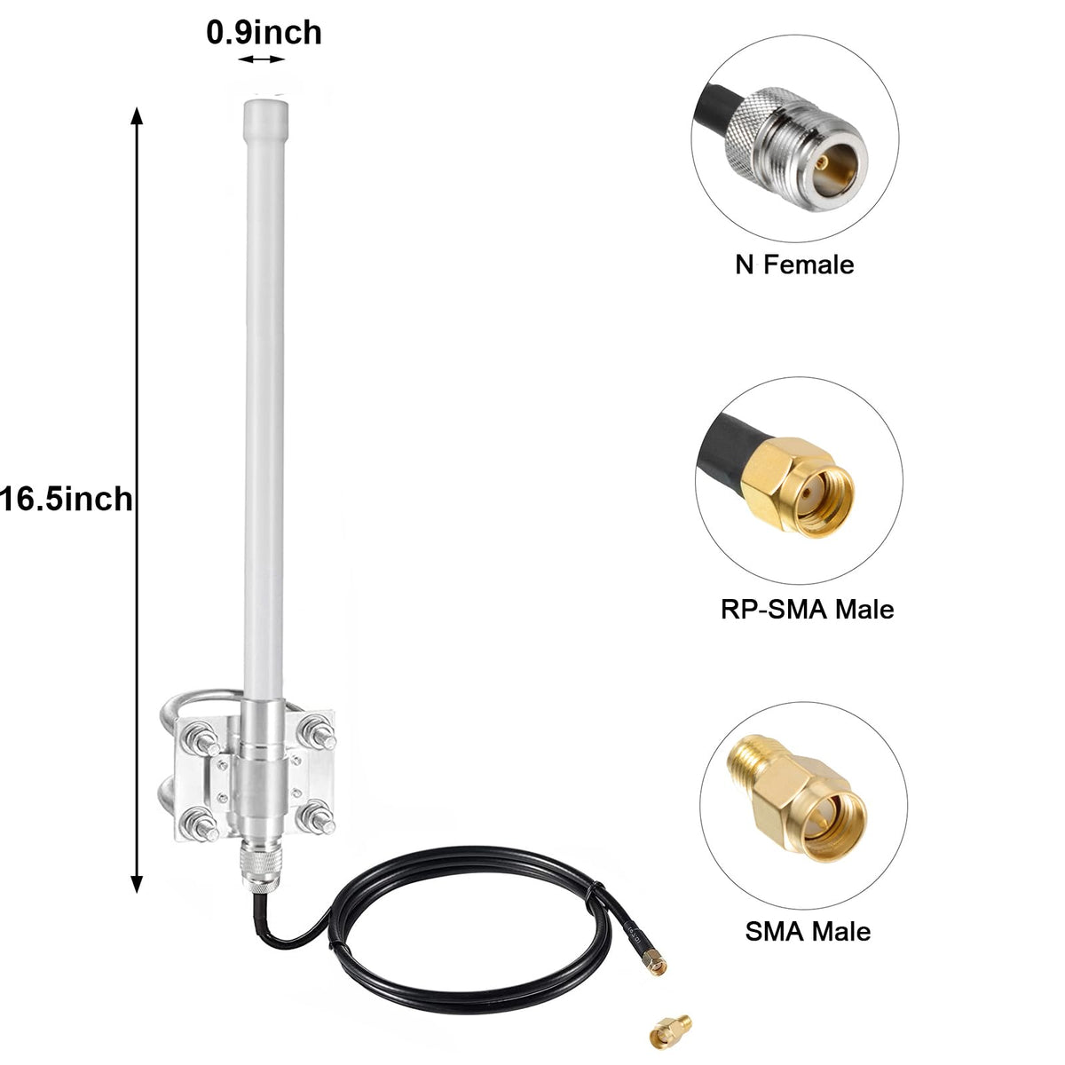 Specification:Frequency : 900 - 930Mhz;Feature: Fixed Wall Mount; Antenna Gain : 5.8 Dbi Omni-Directional ;Antenna Height:42Cm/16.5Inchantenna Connector:N Male Connector;Impedance : 50 Ohm;Extension Cable: N Female To Rp-Sma Male With 3Meter Low Loss Ksr200 Cable;Adapter:Rp-Sma Female To Sma Male;Operating Temperature: -20? ~ +80?; Storage Temperature: -30? ~ +85?;Package List: 1 X Antenna +1 X Cable+1 X Adapter; (As The Picture Shown)
