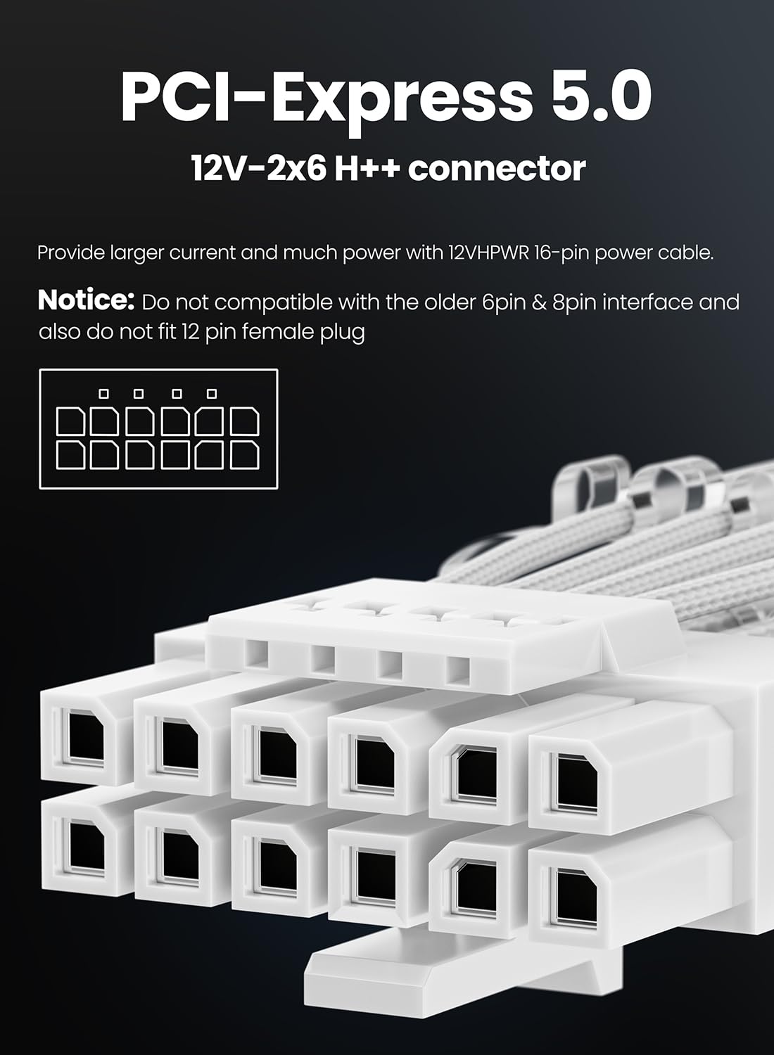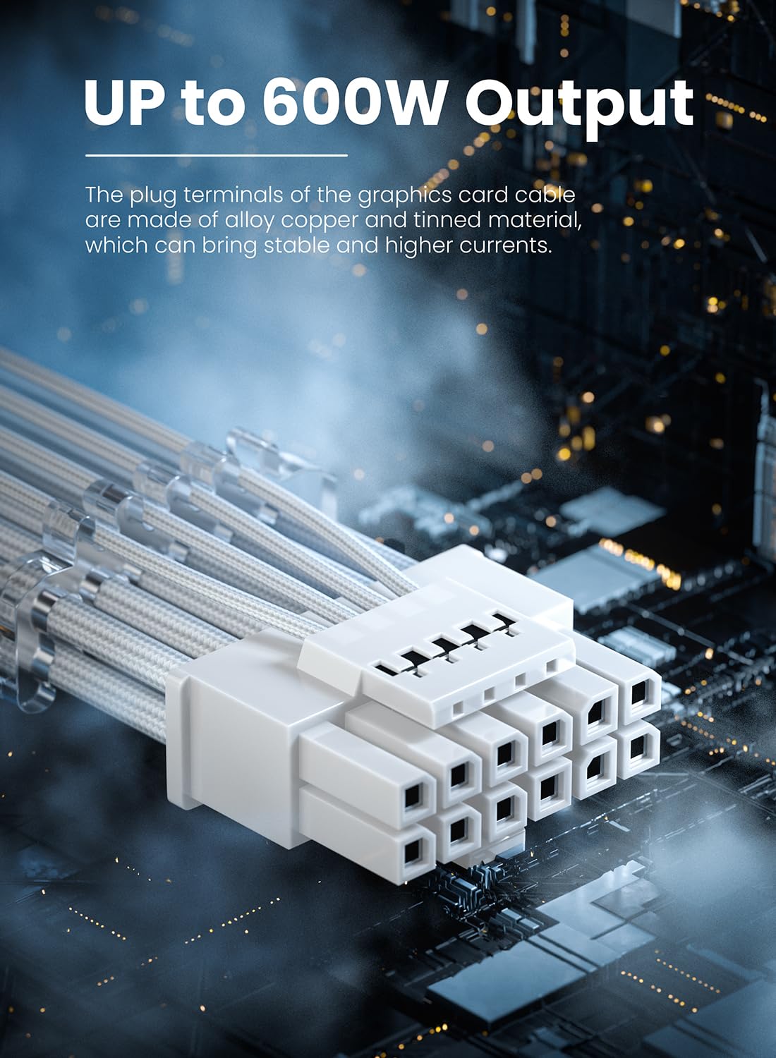 Fasgear Pci-E 5.0 12Vhpwr 16Pin(12+4) Male To Male Sleeved Cabledesigned For Rtx 5090 5080 3090Ti 4070 Ti 4080 4090 Seriesthe Pci-E 5.0 Graphics Cards Will Be Powered From Modular Power Supply Through Only A Single 16-Pin Pcie 5.0 Power Cable Simply. Provide A Stable And Reliable Performance.16Awg Tinned Copper Wirefasgear Pci-E 5.0 Power Cable Contains 16Awg Tinned Copper Wire. Up To 600W Outputfasgear Pci-Express 5.0 Power Cable Supports Up To 600W Output.Neat And Tidywith 4 Transparent Cable Comb Acrylic Clips, Fasgear 70Cm Gpu Power Cable Can Make Your Diy Personal Computer System Neat And Tidy.What You Get1 Pack 70Cm Fasgear Pci-E 5.0 16Pin(12+4) Sleeved Cable With 4 Cable Combs.18-Month Warranty And 24 Hours Customer Service.Questions &Amp; Answersq1: What Kind Of Modular Power Supply Is This Pcie Gen5 Power Cable Compatible With?A1: It Is Compatible With The Modular Power Supply With 12Vhpwr Power Plug (Such As Giga-Byte Gp-Ud1000Gm Pg5). Q2: Can This Gpu Power Cable Work Well With My Geforce Rtx 3080?A2: Due To The Reason That Rtx 3080 Has 12Pin Female, Our 16Pin Gpu Power Cable Cannot Work With Rtx 3080. Our Pci-E 5.0 Power Cable Can Work With 12+4Pin Female Gpu Like Rtx 5090 5080 3090Ti 4070 Ti Rtx 4080 4090 Series.Note1. This Cable'S 16 Pin (12+4) 12Vhpwr Connector Is Only Suitable For Rtx 5090 5080 3090Ti 4070 Ti 4080 4090 And The Modular Power Supply With 12Vhpwr Port. If You Are Not Sure About This Compatibility, Please Feel Free To Contact Us.2. Do Not Recommend You Diy Our Power Cord. Using An Incorrect Way To Remove The Pins May Cause The Pinout To Deform And Be Unable To The Original State. That Will Lead To Poor Contact.