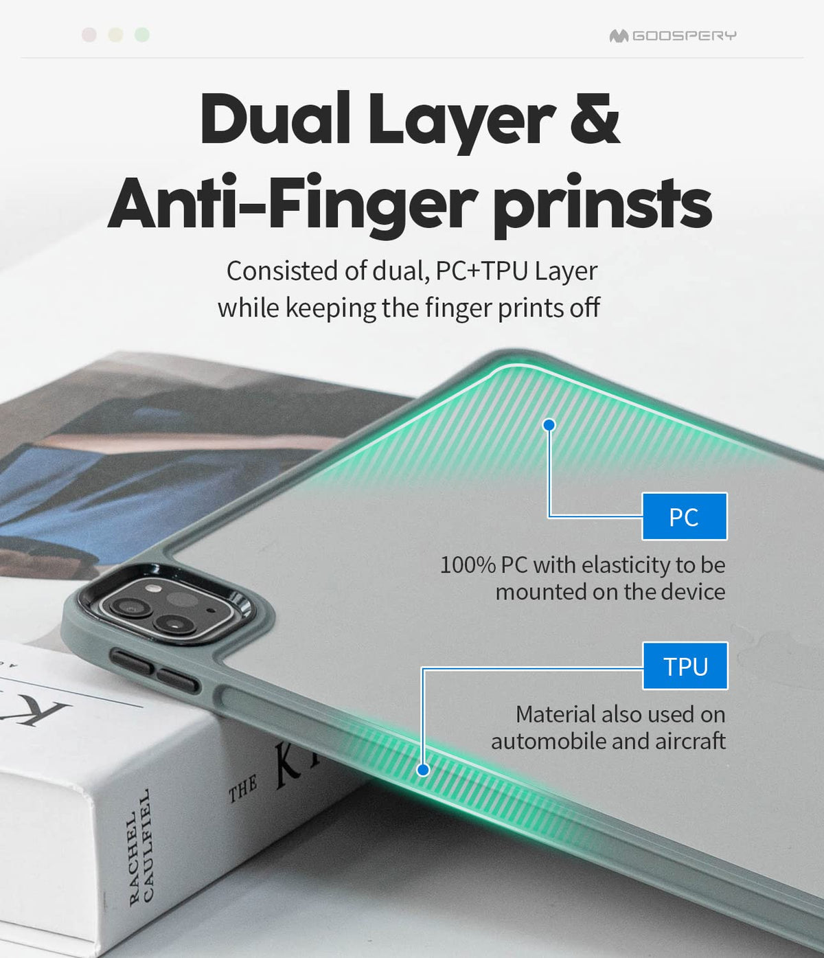 Q: What materials are used in the Goospery Air Shield iPad Pro Case?A: This case is made from durable polycarbonate (PC) and clear thermoplastic polyurethane (TPU), ensuring full protection while maintaining a sleek and lightweight profile.