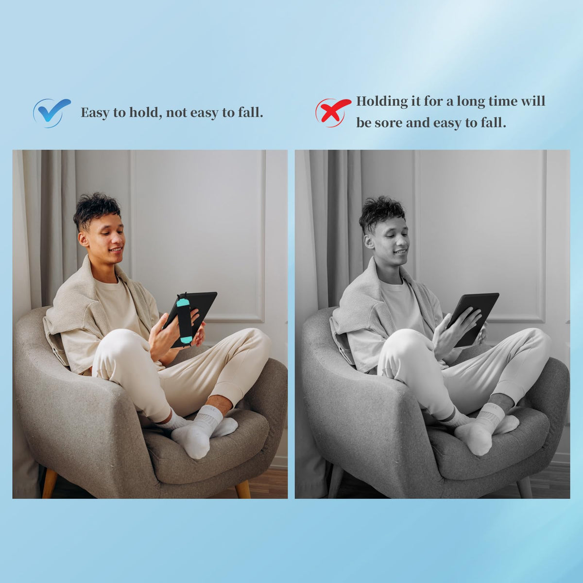 Q: How does the hand strap help reduce hand fatigue?A: The hand strap is designed to alleviate sore hands when using e-readers for extended periods. By securely buckling the strap, users can comfortably hold their devices without worrying about dropping them, which relieves stress and fatigue on their hands.