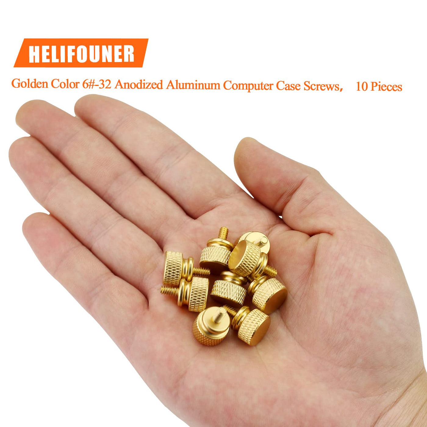 ?Specifications:? - Color: Gold - Size: 6 #-32 - Screw Thread: 6-32 - Material: Anodized Aluminum - Package Included: 10 Pieces Thumb Screws ?Features:? - Made Of High Quality Anodized Aluminum, Light Weight, No Fading, Antistatic, Long Service Life. - Easy To Install, Thumb Screw Design Have An Easy Grip Head Which Is Simple By Hand Installation. - Total 10 Pieces Gold Color Anodized Aluminum Thumb Screws, Enough Quantities Can Meet Your Daily Life Using. - Helifouner Thumb Screws Are Widely Used For Most Computer Case, Cover, Power Supply, Hard Drives, Motherboard Mounting. ?Package Included:? Helifouner 10 Pieces Gold Color Anodized Aluminum Computer Case Thumbscrews. Choking Hazard -- Small Parts. Not For Children Under 3 Years. Note: 1, Warning: Small Parts, Keep Away From Children And Kids. 2, If You Have Any Questions, Please Feel Free To Contact Us At Any Time.