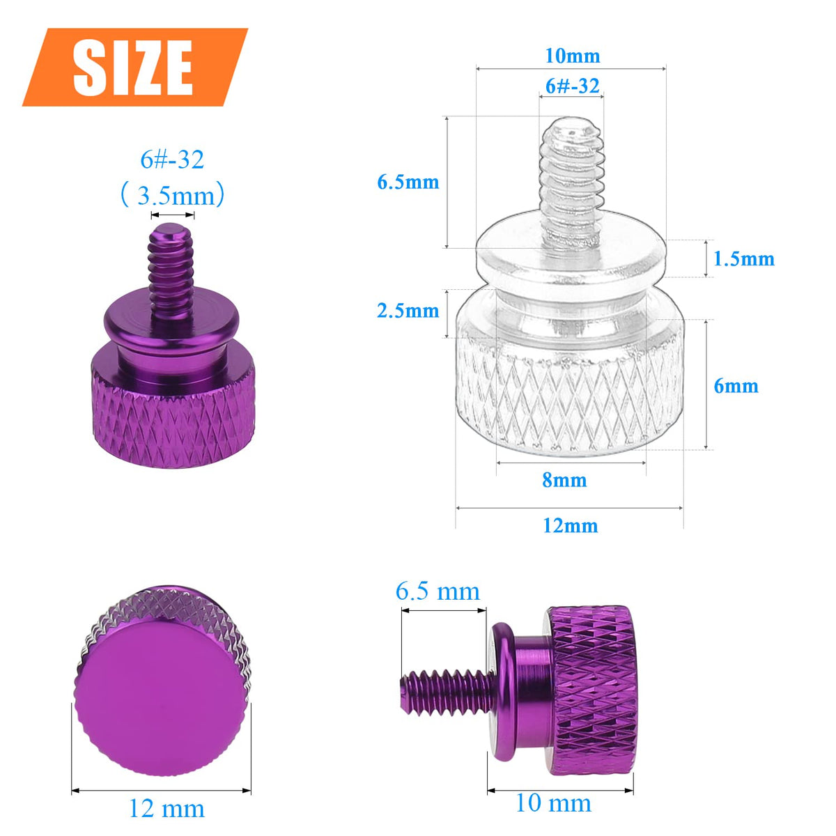 ?Specifications:? - Color: Purple - Size: 6 #-32 - Screw Thread: 6-32 - Material: Anodized Aluminum - Package Included: 10 Pieces Thumb Screws ?Features:? - Made Of High Quality Anodized Aluminum, Light Weight, No Fading, Antistatic, Long Service Life. - Easy To Install, Thumb Screw Design Have An Easy Grip Head Which Is Simple By Hand Installation. - Total 10 Pieces Purple Color Anodized Aluminum Thumb Screws, Enough Quantities Can Meet Your Daily Life Using. - Helifouner Thumb Screws Are Widely Used For Most Computer Case, Cover, Power Supply, Hard Drives, Motherboard Mounting. ?Package Included:? Helifouner 10 Pieces Purple Color Anodized Aluminum Computer Case Thumbscrews. Choking Hazard -- Small Parts. Not For Children Under 3 Years. Note: 1, Warning: Small Parts, Keep Away From Children And Kids. 2, If You Have Any Questions, Please Feel Free To Contact Us At Any Time.