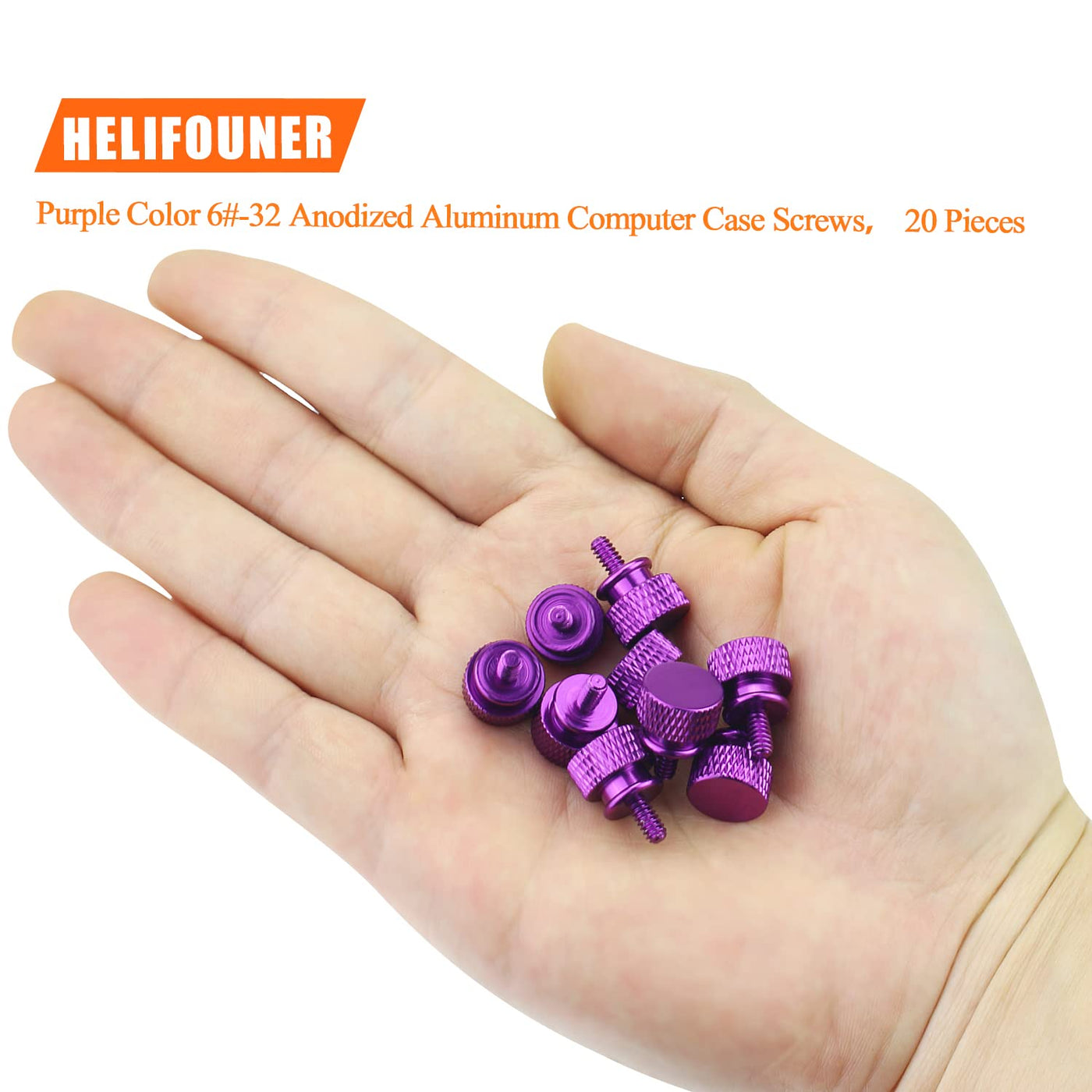 ?Specifications:? - Color: Purple - Size: 6 #-32 - Screw Thread: 6-32 - Material: Anodized Aluminum - Package Included: 20 Pieces Thumb Screws ?Features:? - Made Of High Quality Anodized Aluminum, Light Weight, No Fading, Antistatic, Long Service Life. - Easy To Install, Thumb Screw Design Have An Easy Grip Head Which Is Simple By Hand Installation. - Total 20 Pieces Purple Color Anodized Aluminum Thumb Screws, Enough Quantities Can Meet Your Daily Life Using. - Helifouner Thumb Screws Are Widely Used For Most Computer Case, Cover, Power Supply, Hard Drives, Motherboard Mounting. ?Package Included:? Helifouner 20 Pieces Purple Color Anodized Aluminum Computer Case Thumbscrews. Choking Hazard -- Small Parts. Not For Children Under 3 Years. Note: 1, Warning: Small Parts, Keep Away From Children And Kids. 2, If You Have Any Questions, Please Feel Free To Contact Us At Any Time.